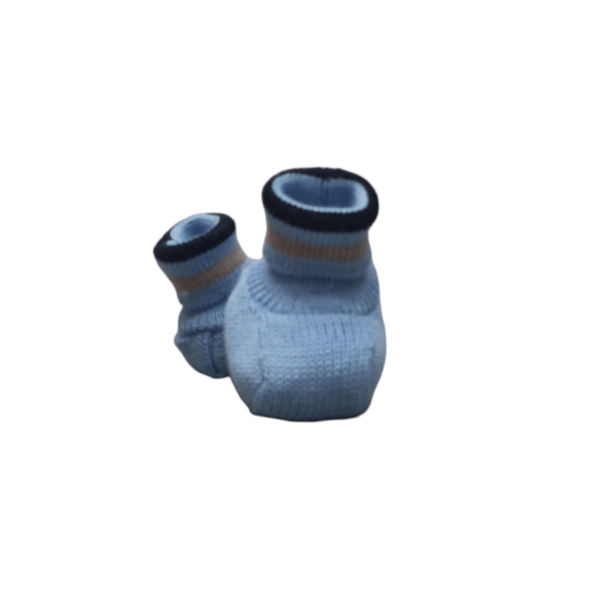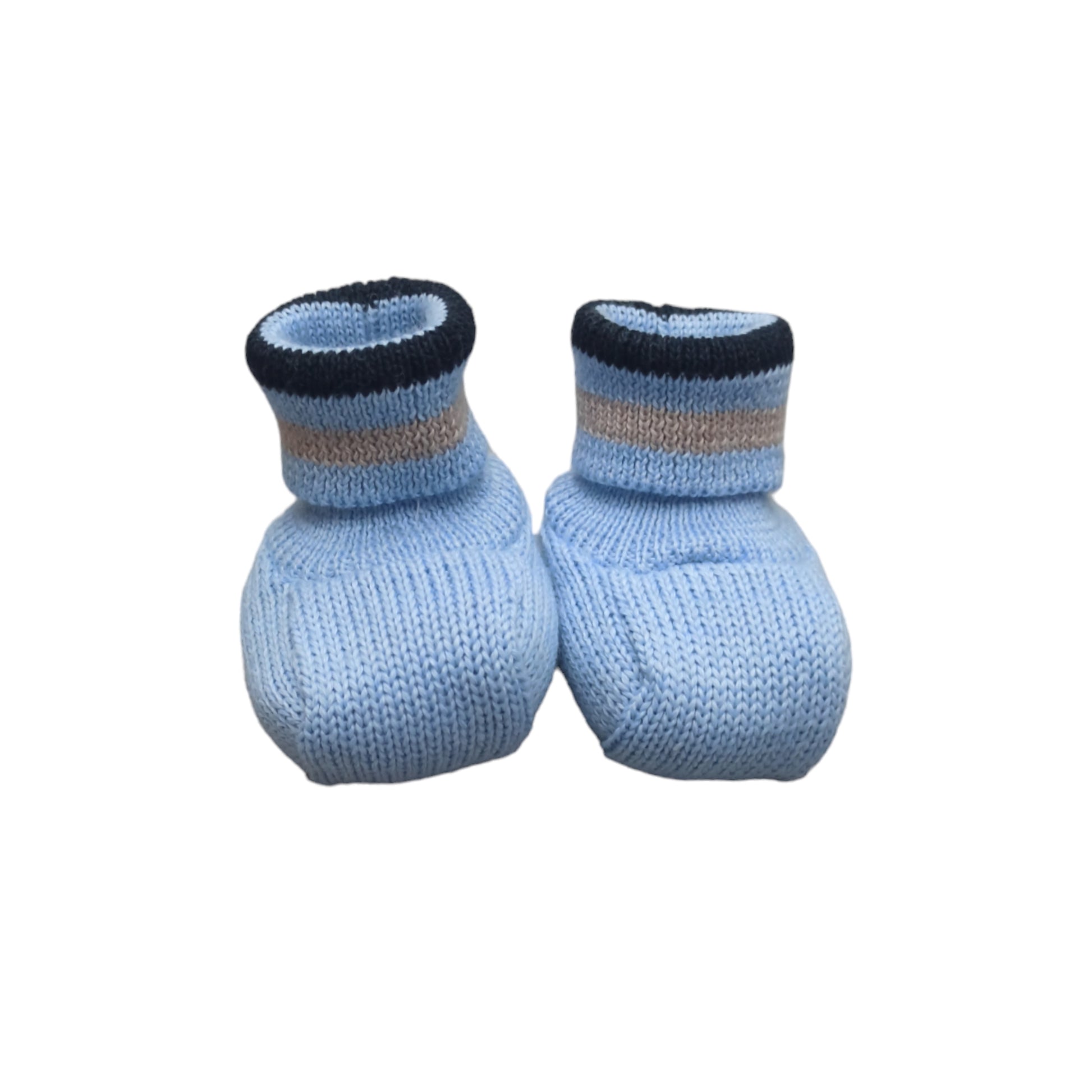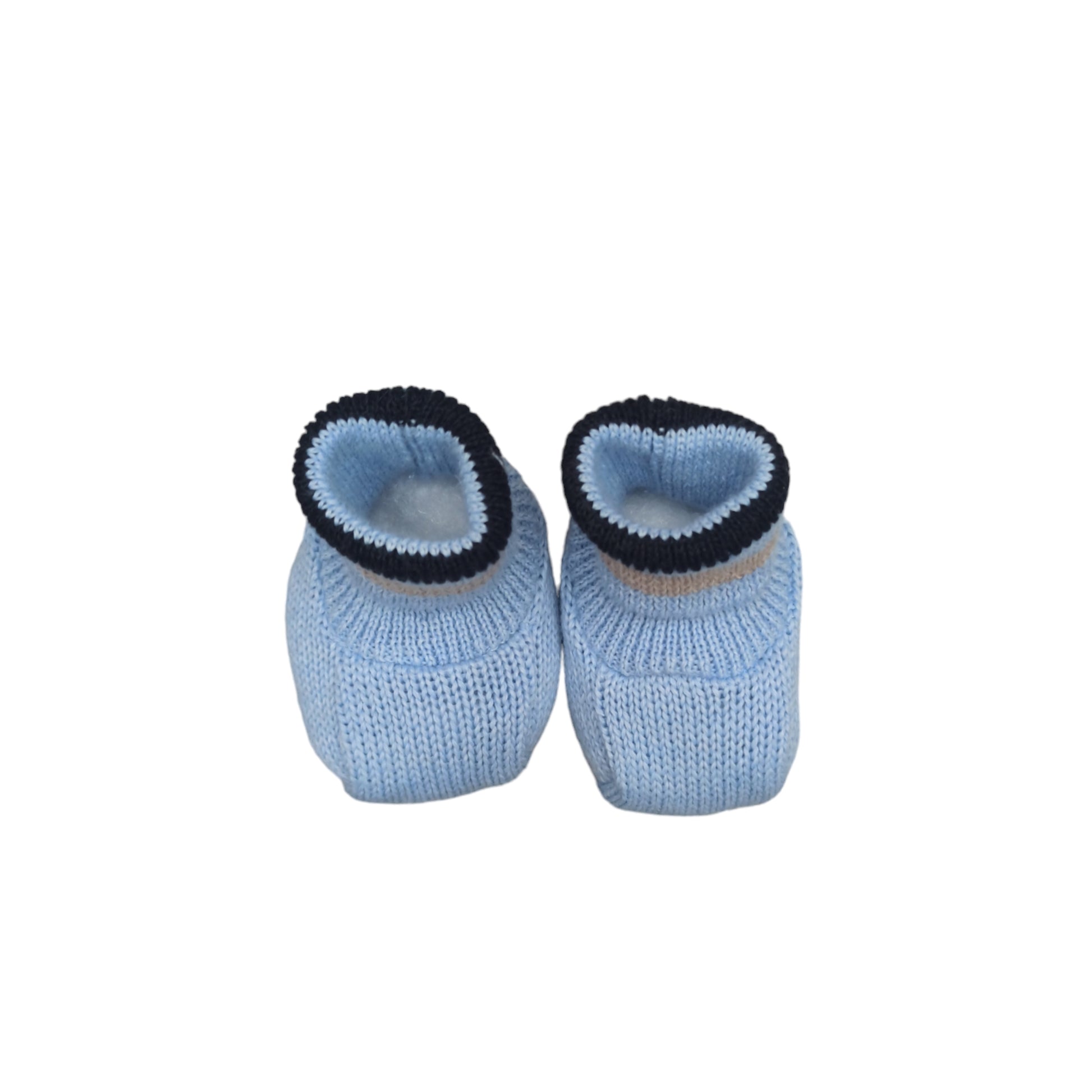 Coppia di calzini a scarpetta morbidi in lana con finitura blu e beige, misura nascita.