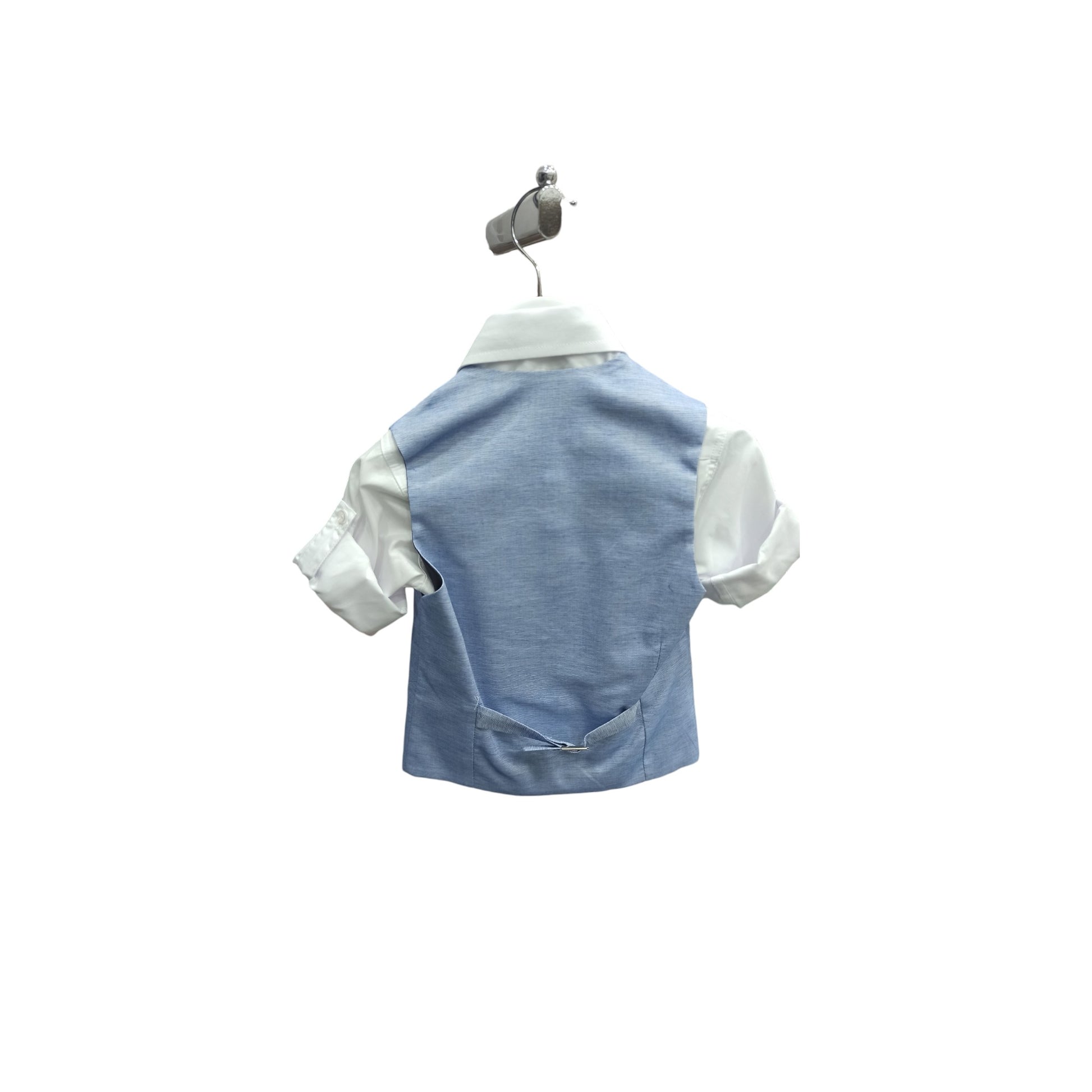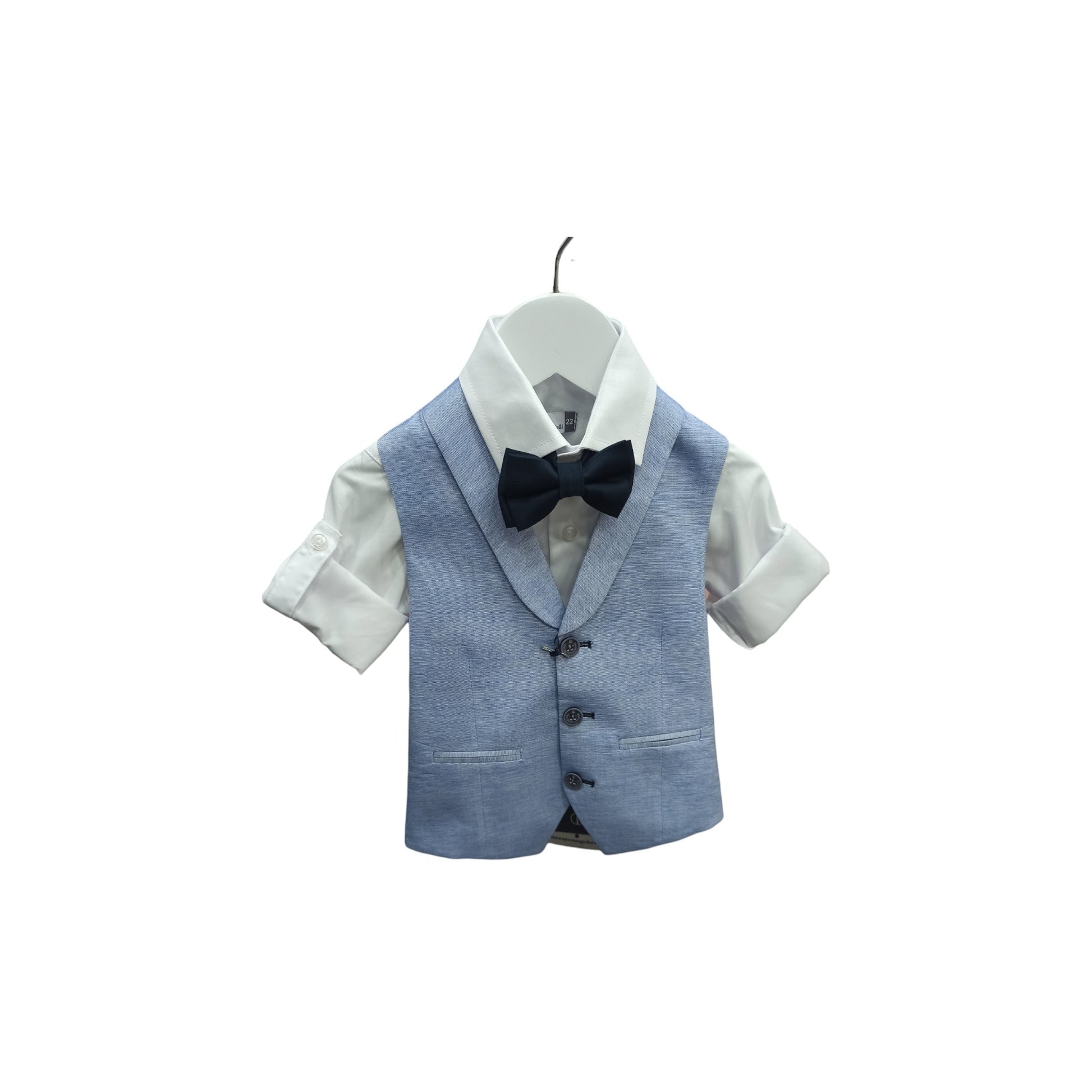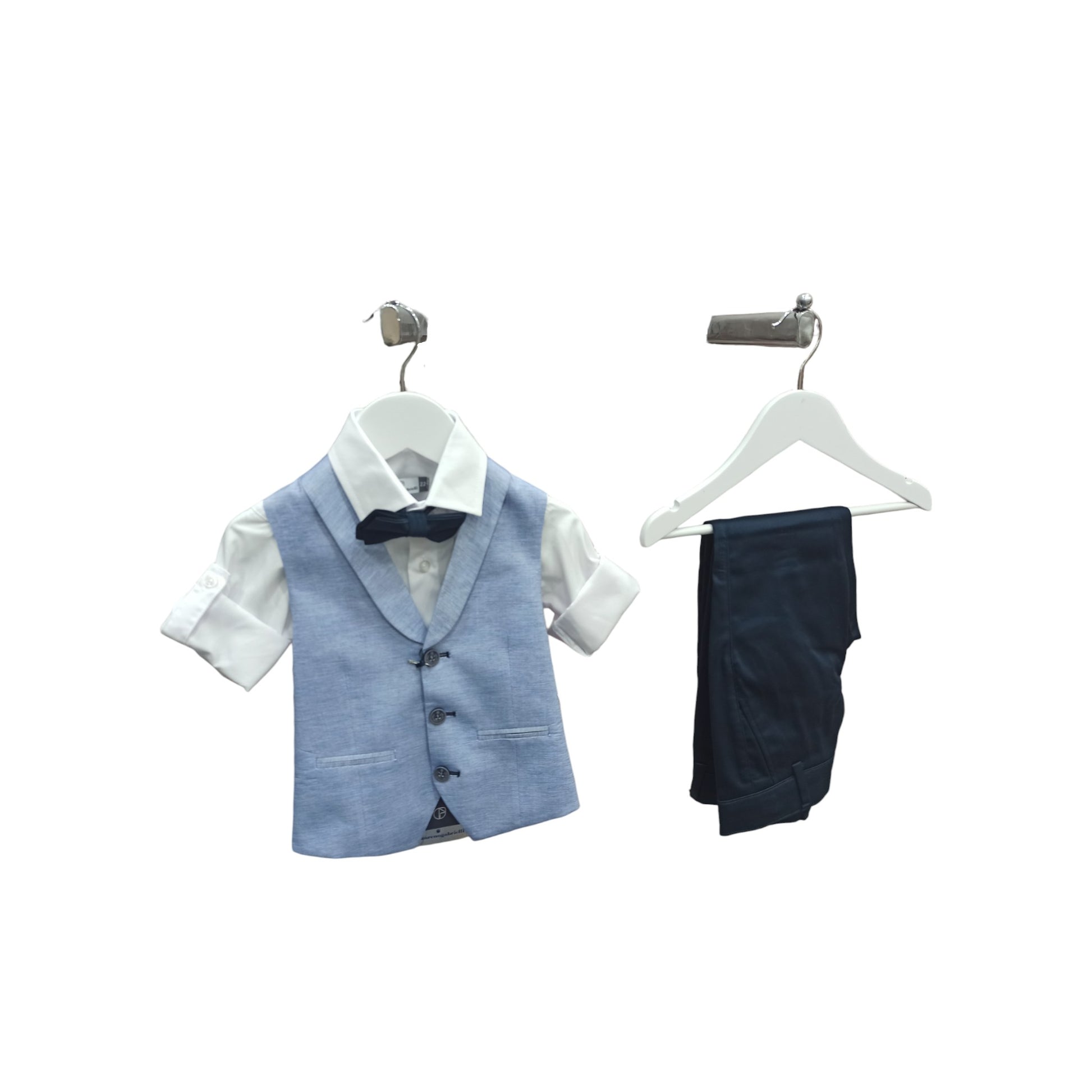 Completo cerimonia 4 pz composto da pantalone tasca America in tessuto rasato, panciotto con collo sciallato e papillon coordinato blu come il pantalone, camicia classica con laccetto alle maniche per bloccare il risvolto.
