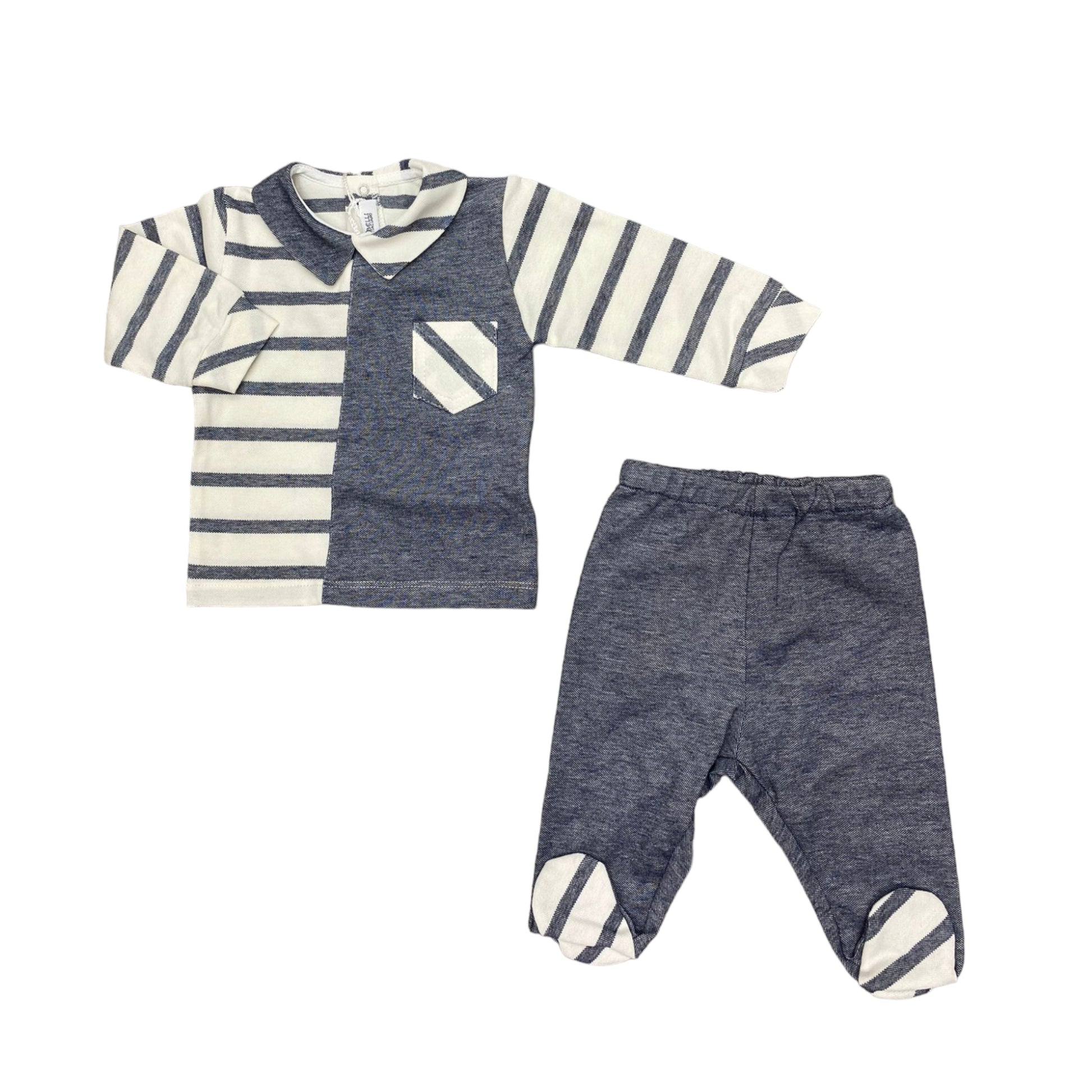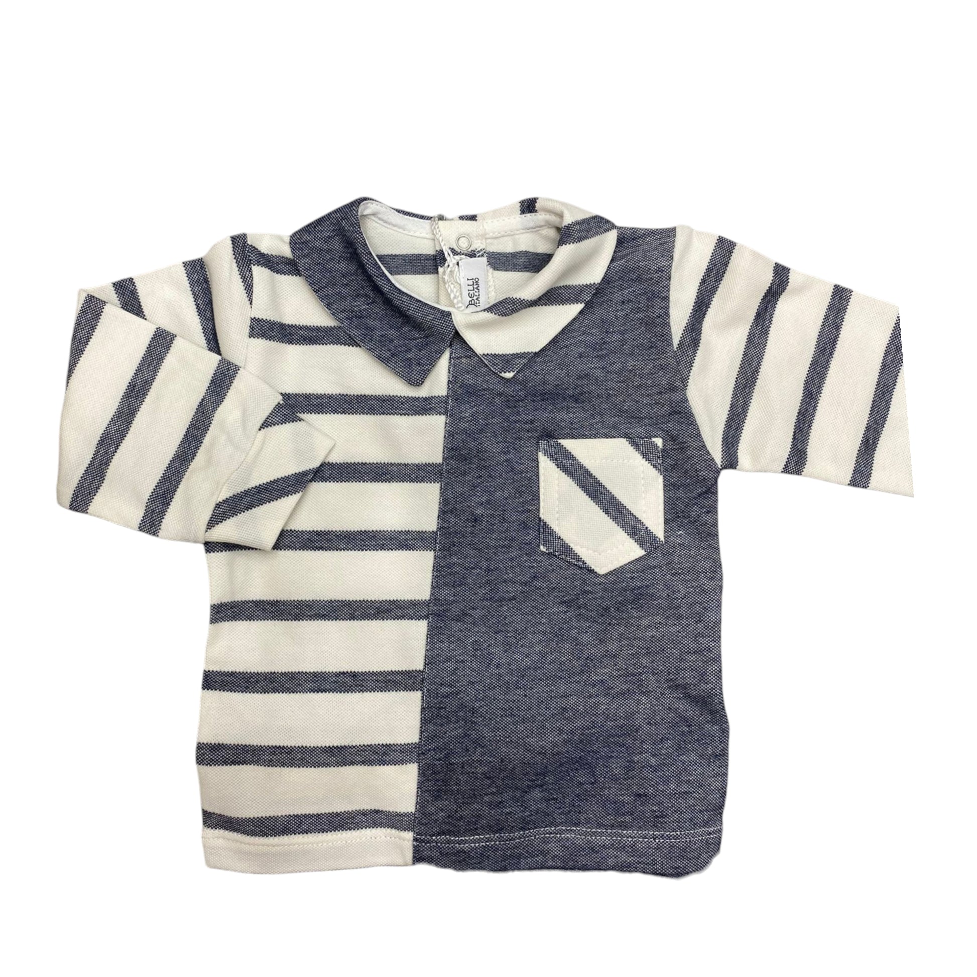 Completo clinico composto da maglietta a polo bicolore, con parte rigata e parte tinta unita con taschino a contrasto, colletto bicolore e applicazione a righe sotto ai piedini, apertura della maglia sul retro per facilitare il cambio.