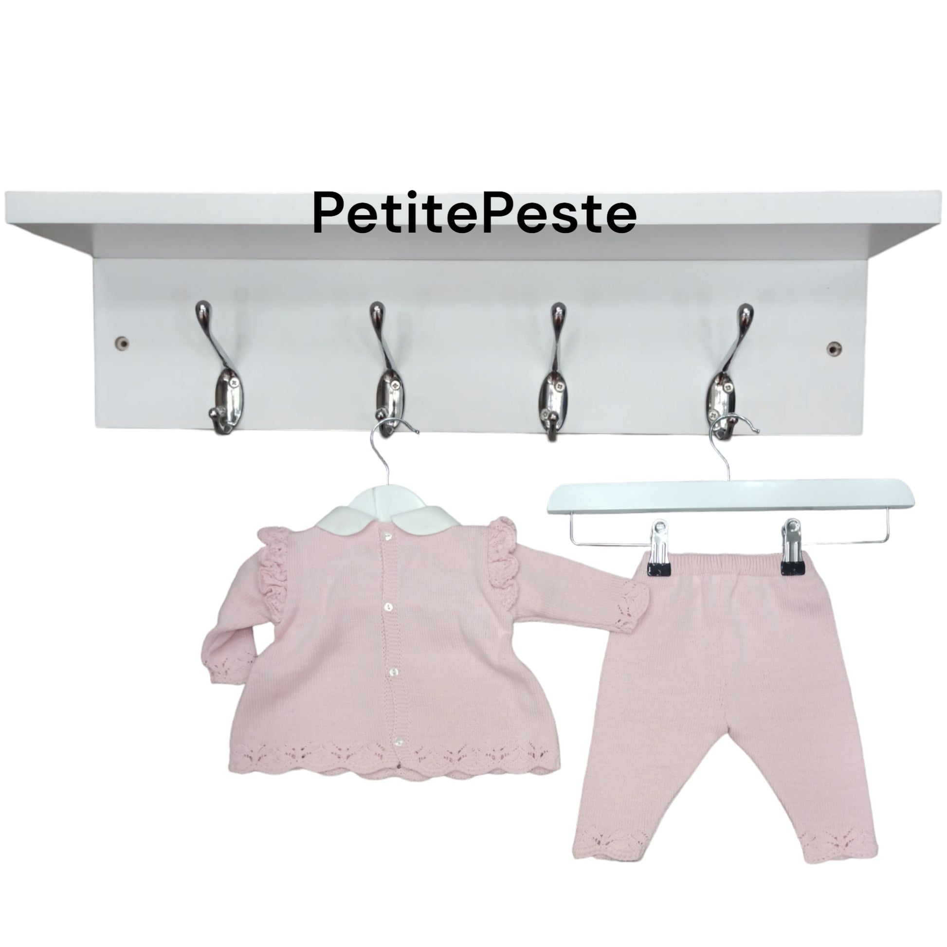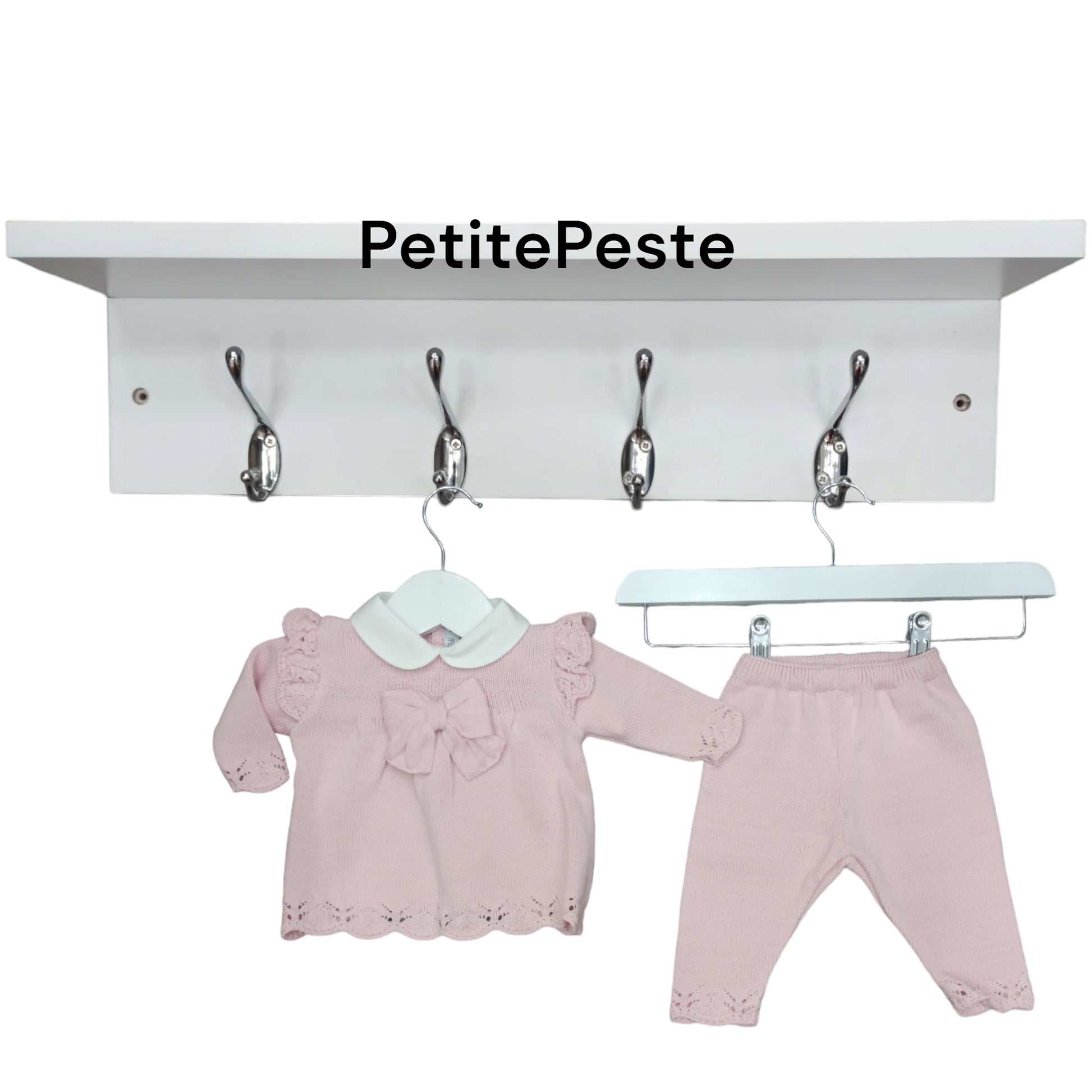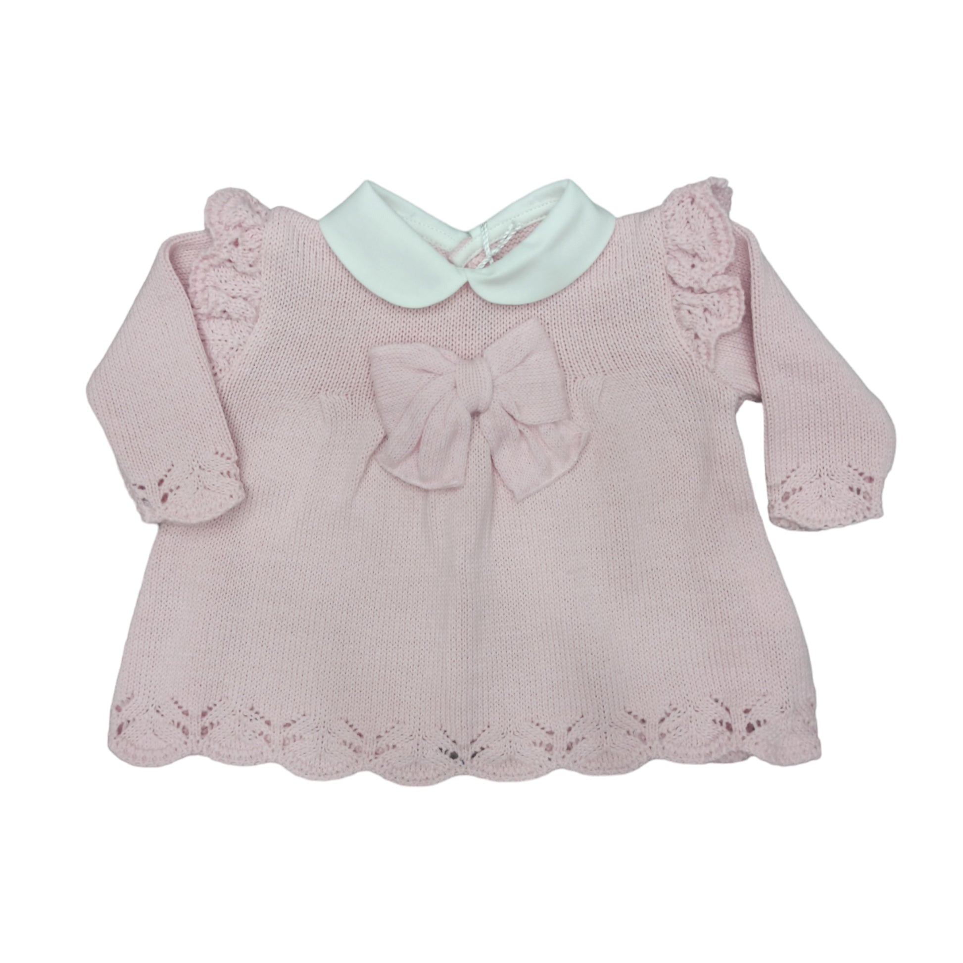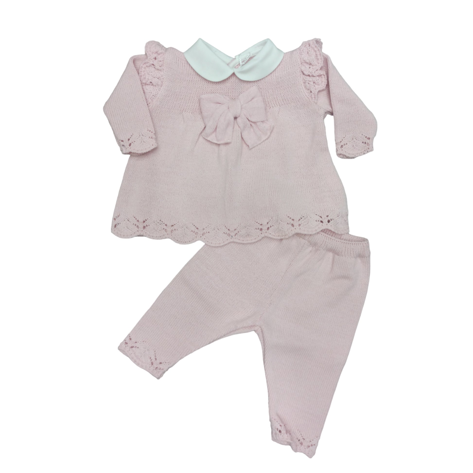 Completo clinico nascita composto da vestina in lana con fiocco tono su tono, rushes alle spalle, smerlo sul fondo e ai polsi colletto in tessuto a contrasto e leggings in lana con smerlo sul fondo, maglia con apertura sul retro per facilitare il cambio.