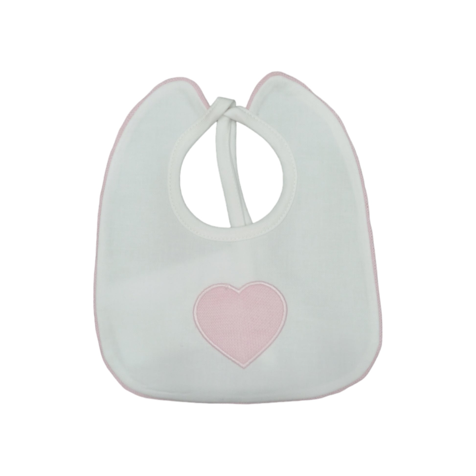 Coordinato composto da bavetta in ciniglia con cuore e bordino ricamato a risalto e cappello in lana a cuffietta con smerlo sul fondo.