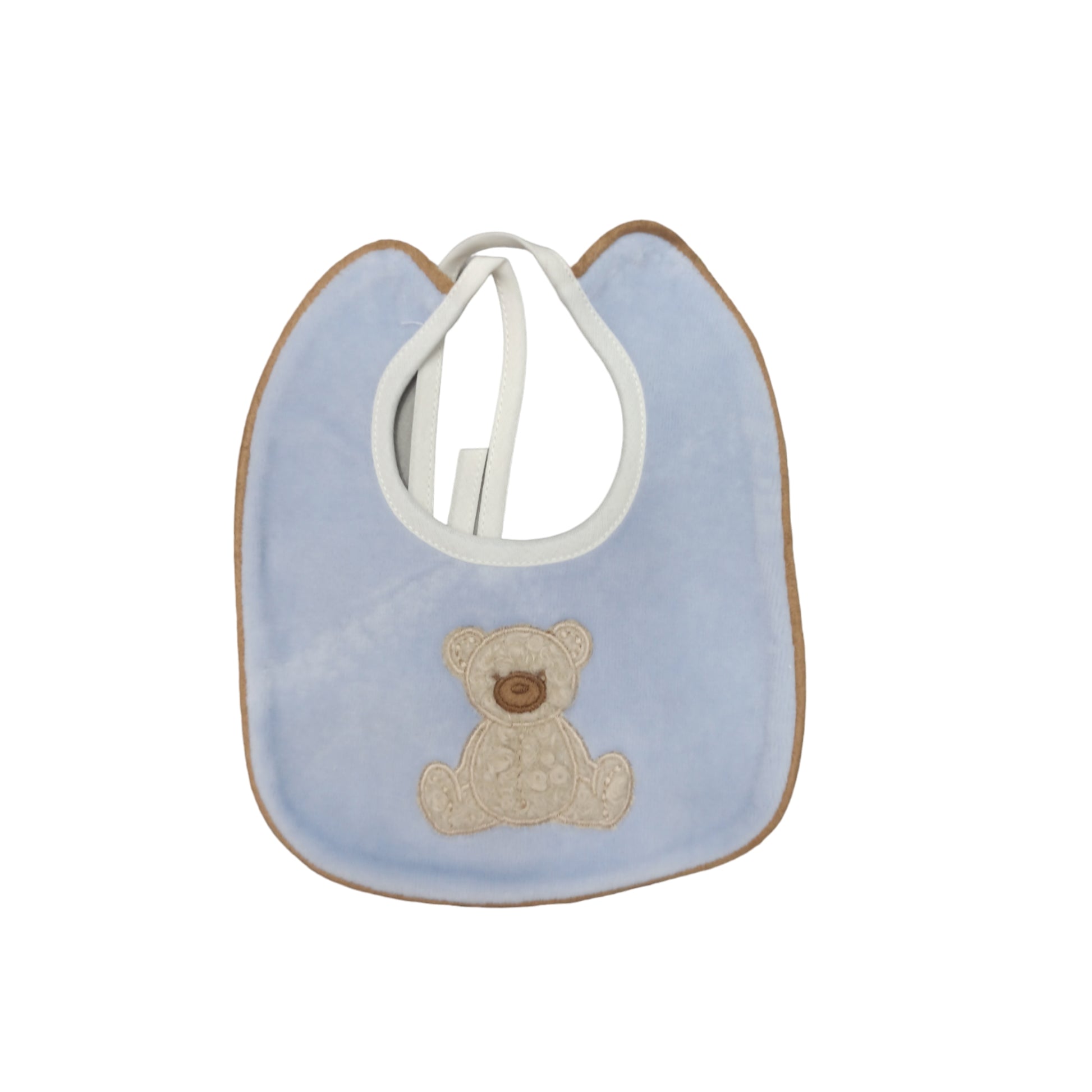 Coordinato composto da bavetta in ciniglia con orsetto in lana ricamato a risalto e cappello in lana a cuffietta.