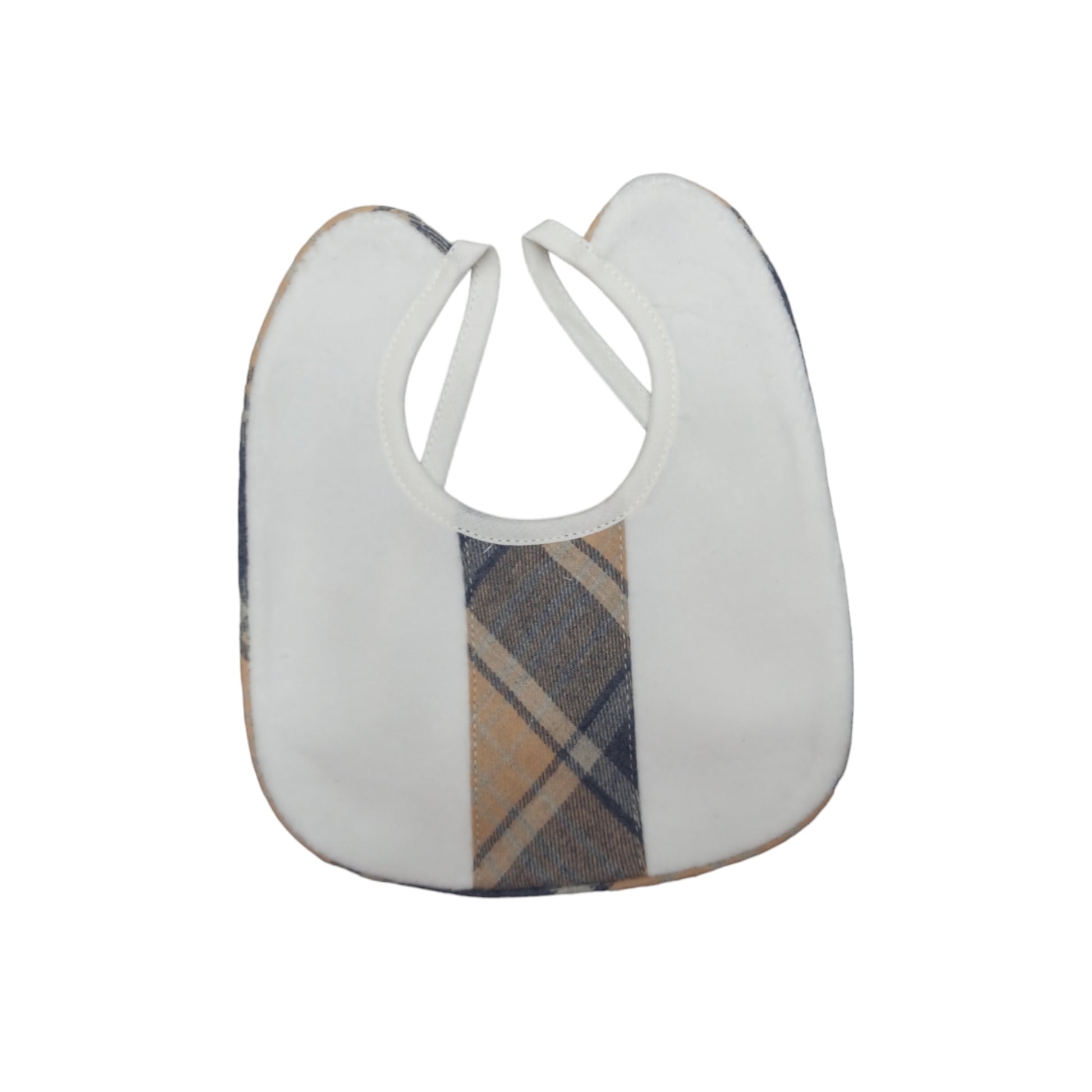 Coordinato composto da bavetta in ciniglia con striscia in jacquard applicata anche sul risvolto del cappello.