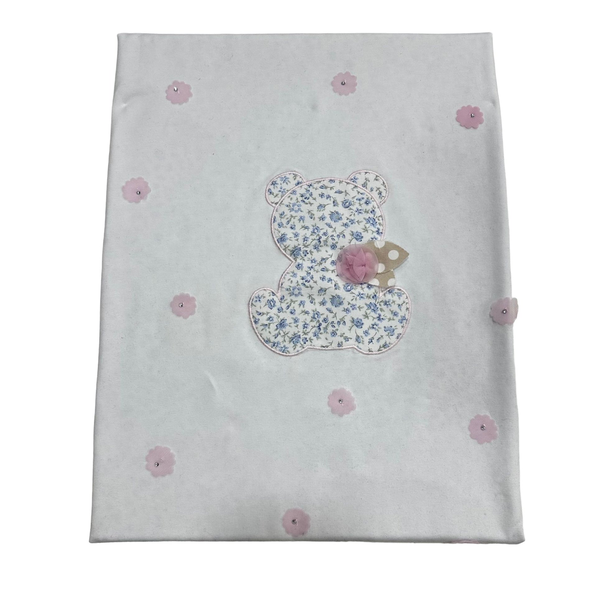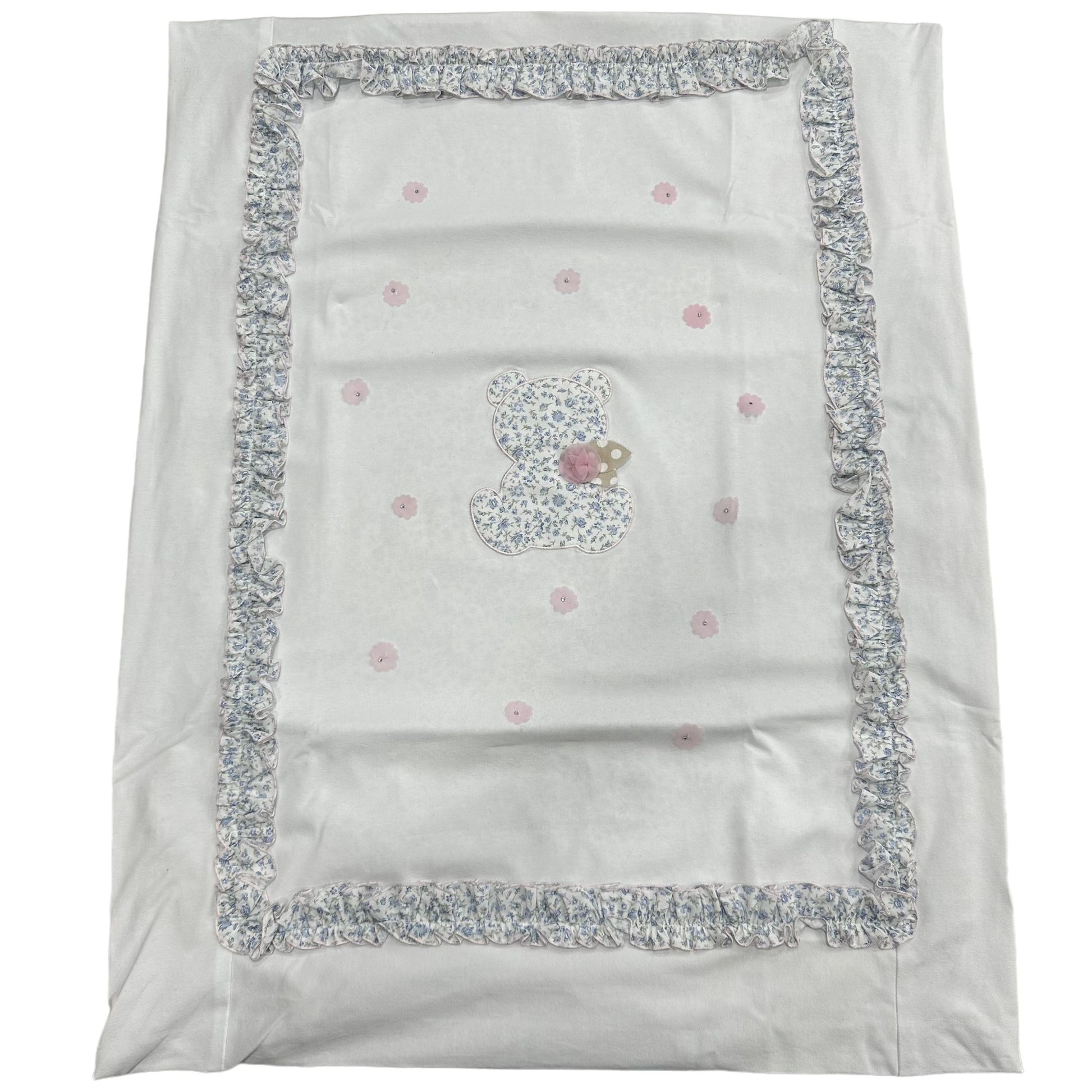 Coperta in cotone con fascia a fiori azzurri in tessuto accoppiato e orsetto a rilievo in fantasia a fiori con fiorellini , sfoderabile per permettere un comodo lavaggio e l'uso anche nei periodi piu' caldi trasformandola in una coperta sottilissima.