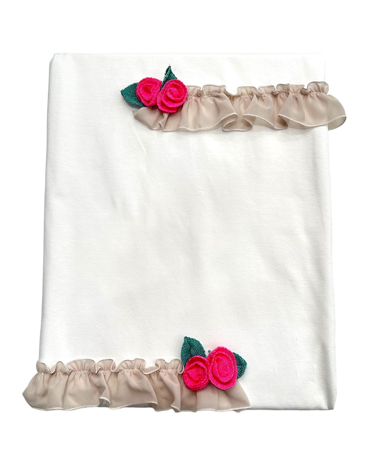 Coperta in cotone jersey con applicazioni in chiffon beige e roselline con foglie in finitura, sfoderabile per permettere un comodo lavaggio e l'uso anche nei periodi piu' caldi trasformandola in una coperta sottilissima.