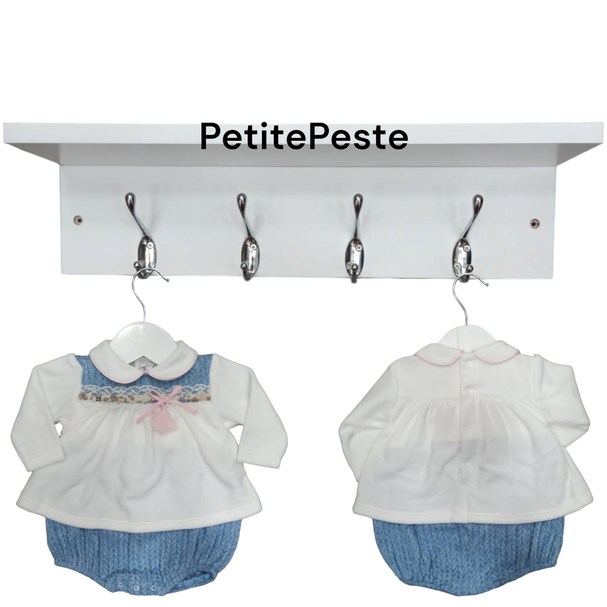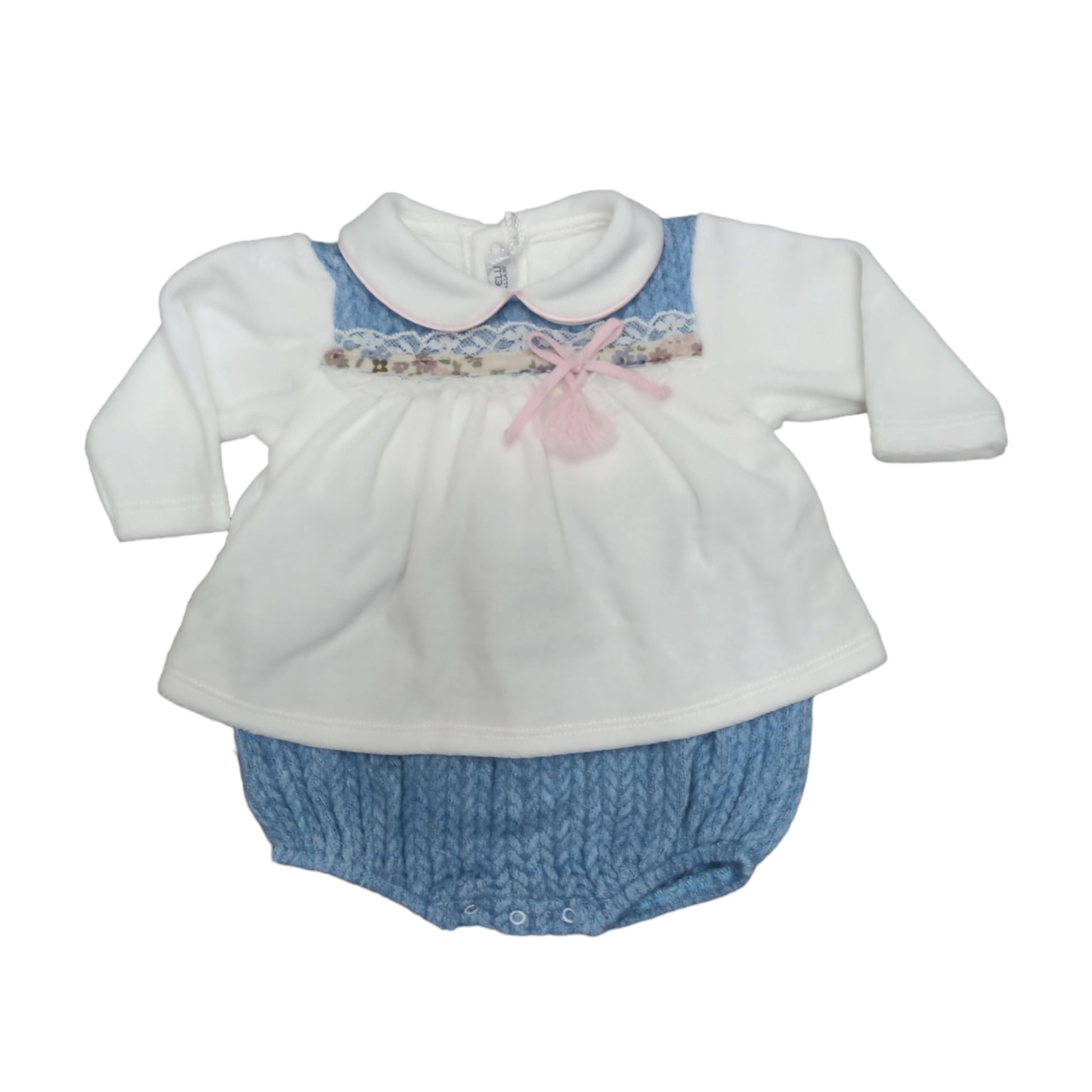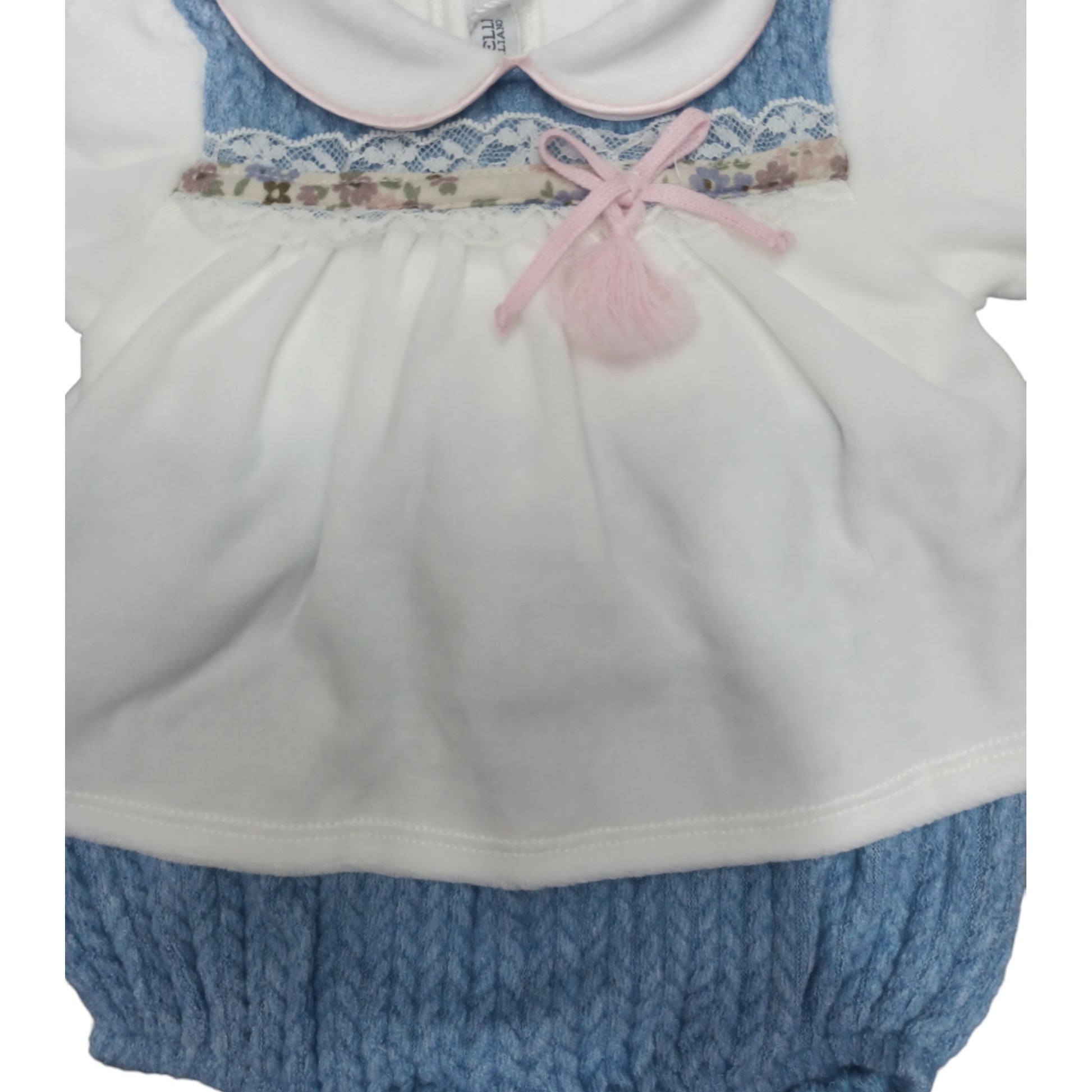 Pagliaccetto nascita in ciniglia giro manica con fondo e parte superiore in tessuto lana effetto spigato, applicazione di tessuto a fiori fantasia e pizzo, apertura sul fondo e sul retro per facilitare il cambio,