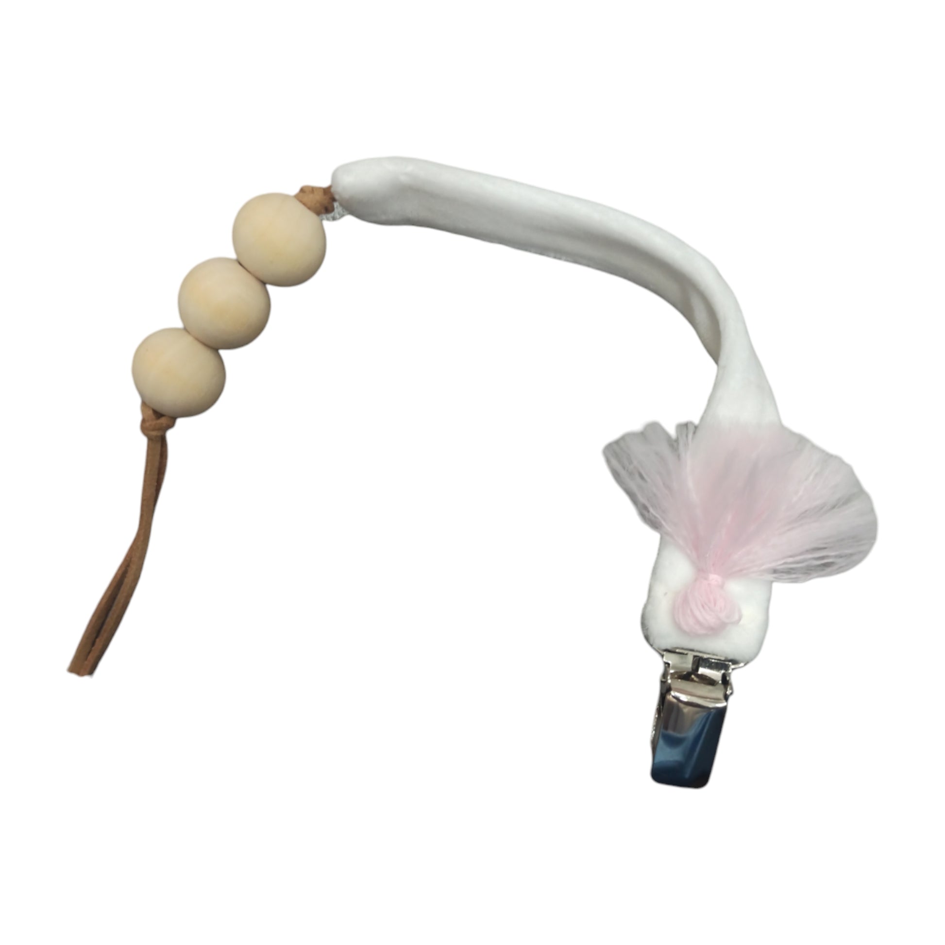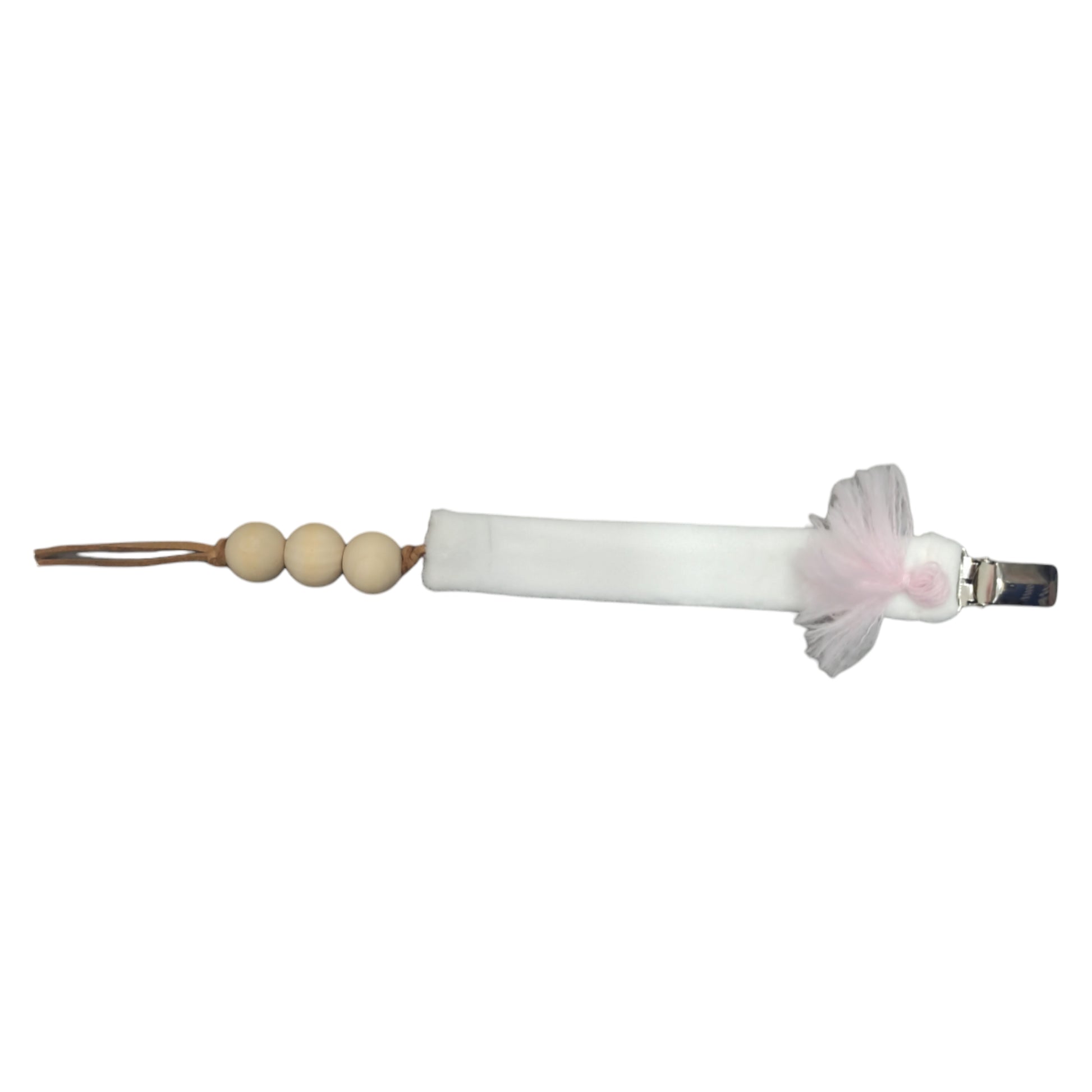 Portaciuccio in ciniglia con pizzo rosa applicato, clip in metallo e laccetto in caucciù e legno.