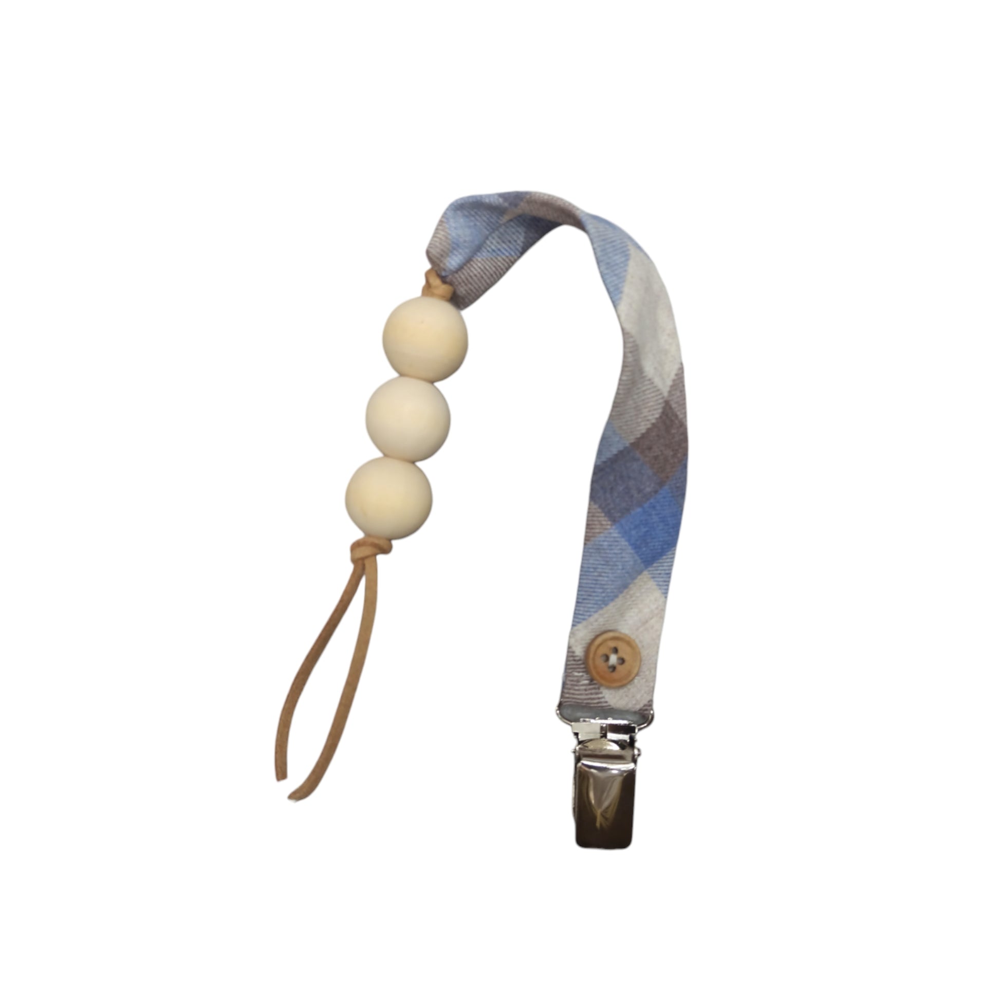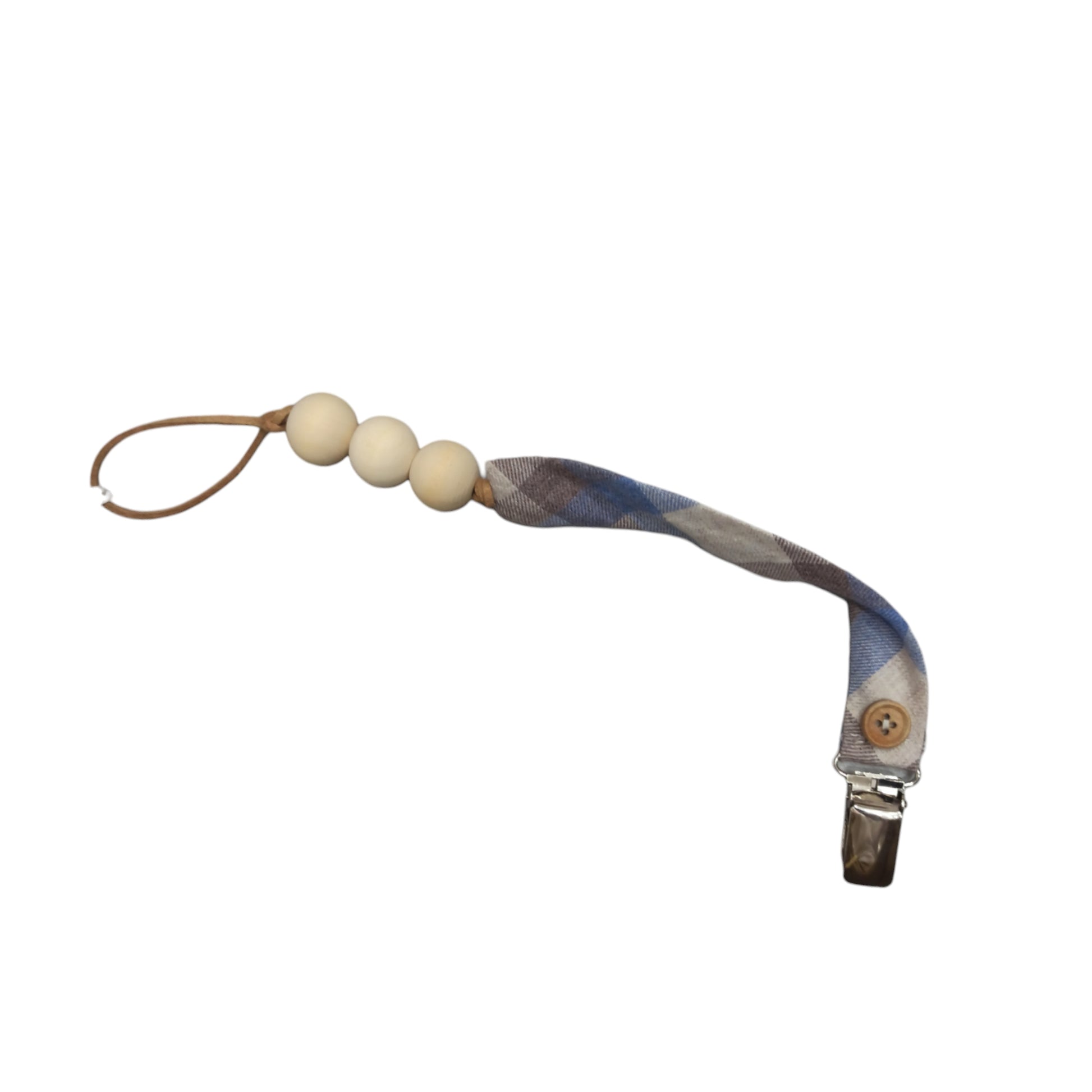 Portaciuccio in tessuto jacquard con clip in metallo e finitura in legno e caucciù.