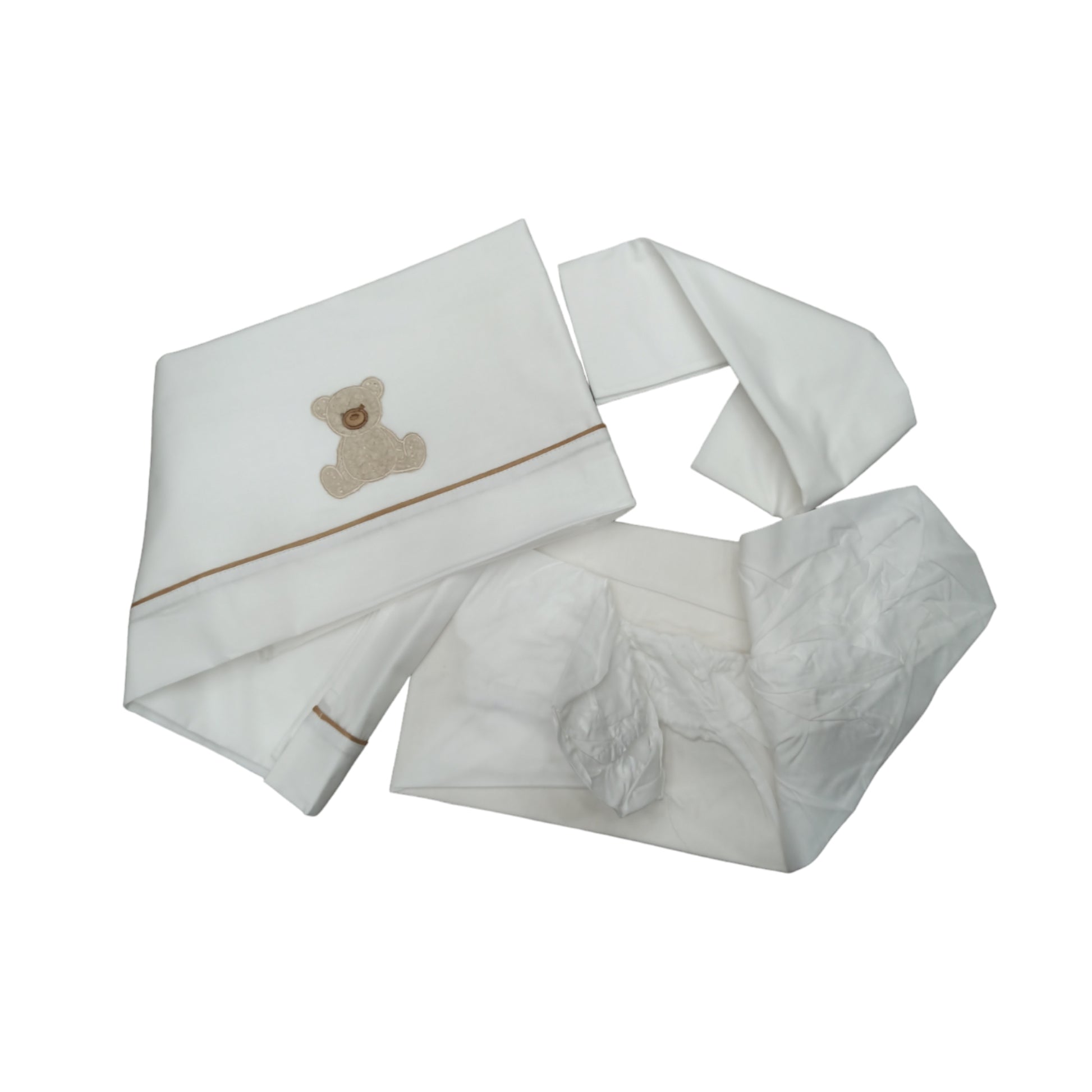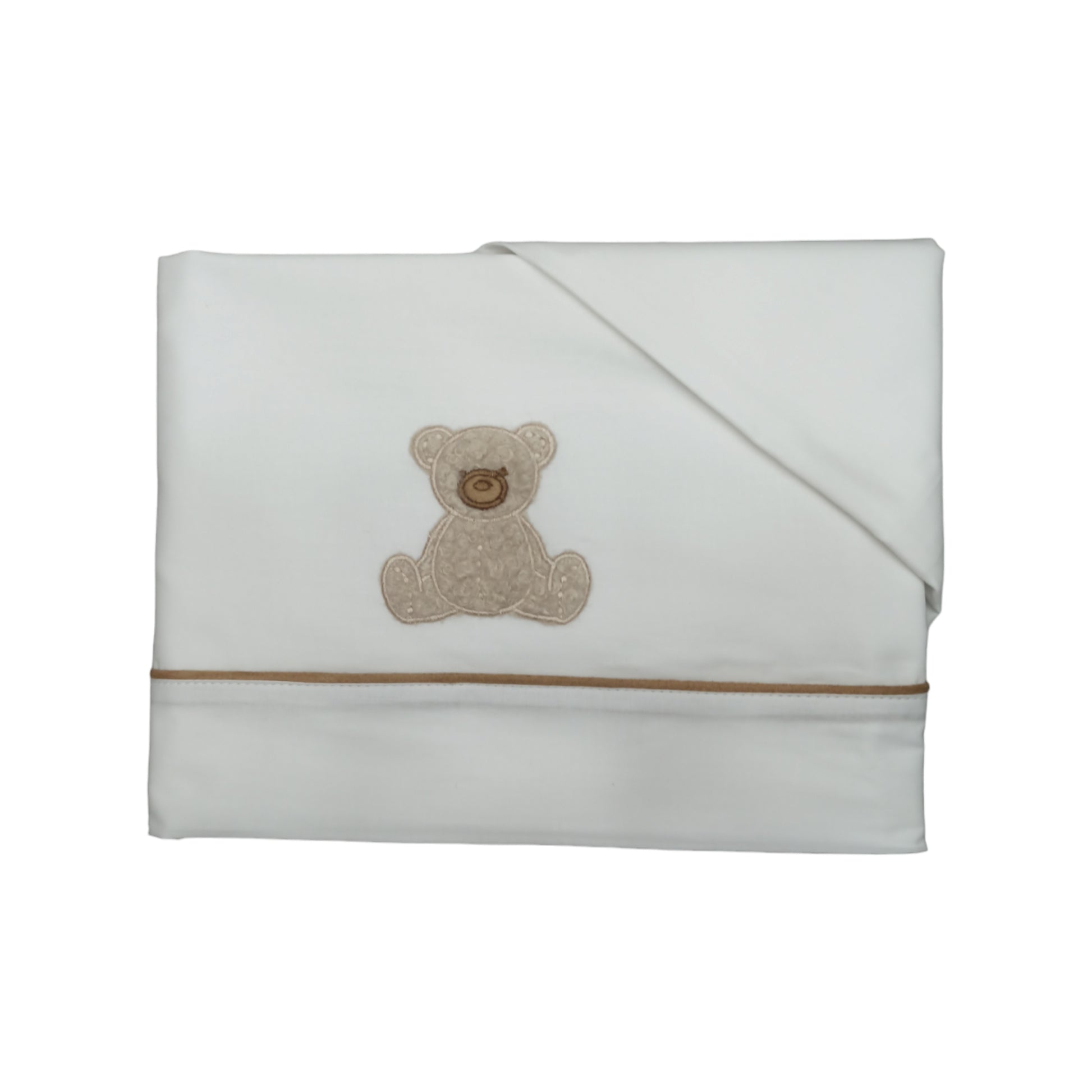 Set lenzuola cotone con applicazione di orsetto ricamato a risalto in pelliccia sulla piega e riga in contrasto, composto da sopra, sotto sempre teso con elastici perimetrali e federa.
