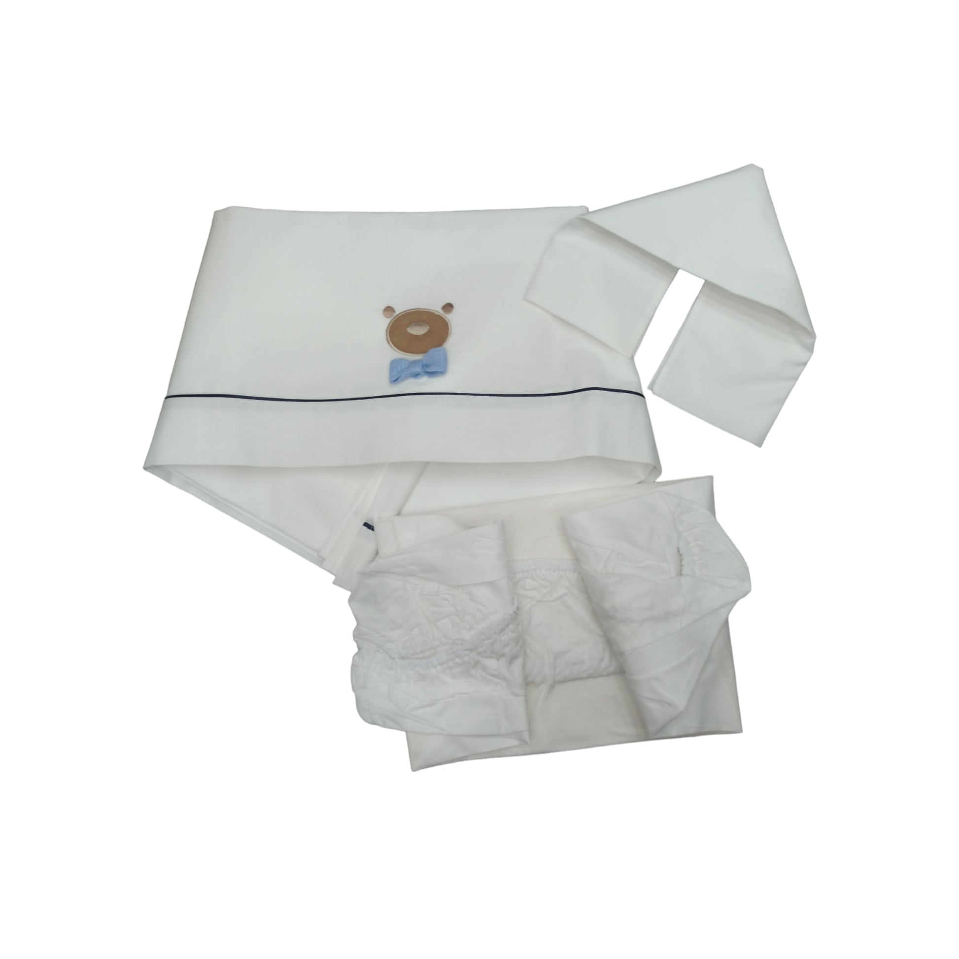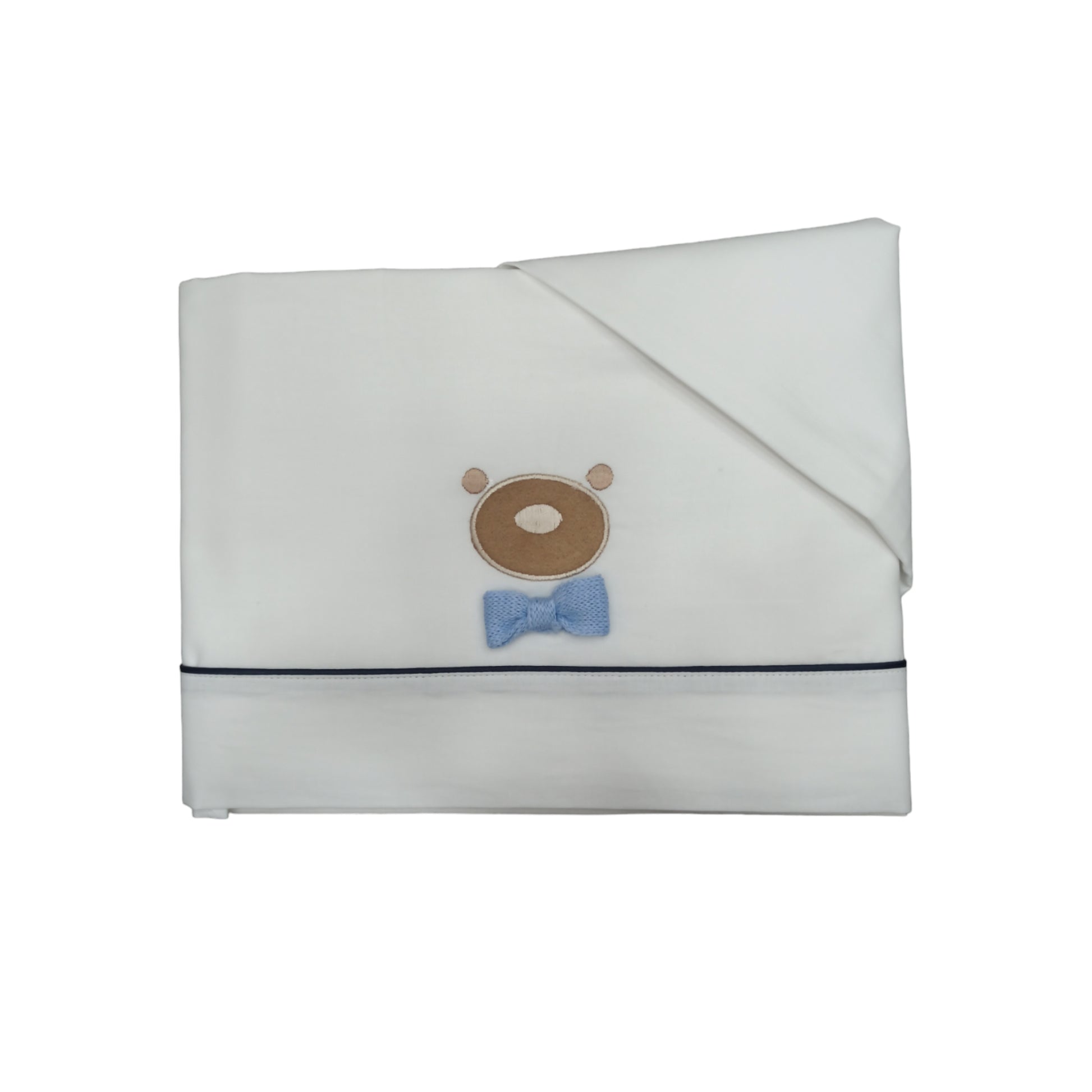 Set lenzuola cotone con applicazione di orsetto ricamato sulla piega, composto da sopra, sotto sempre teso con elastici perimetrali e federa.