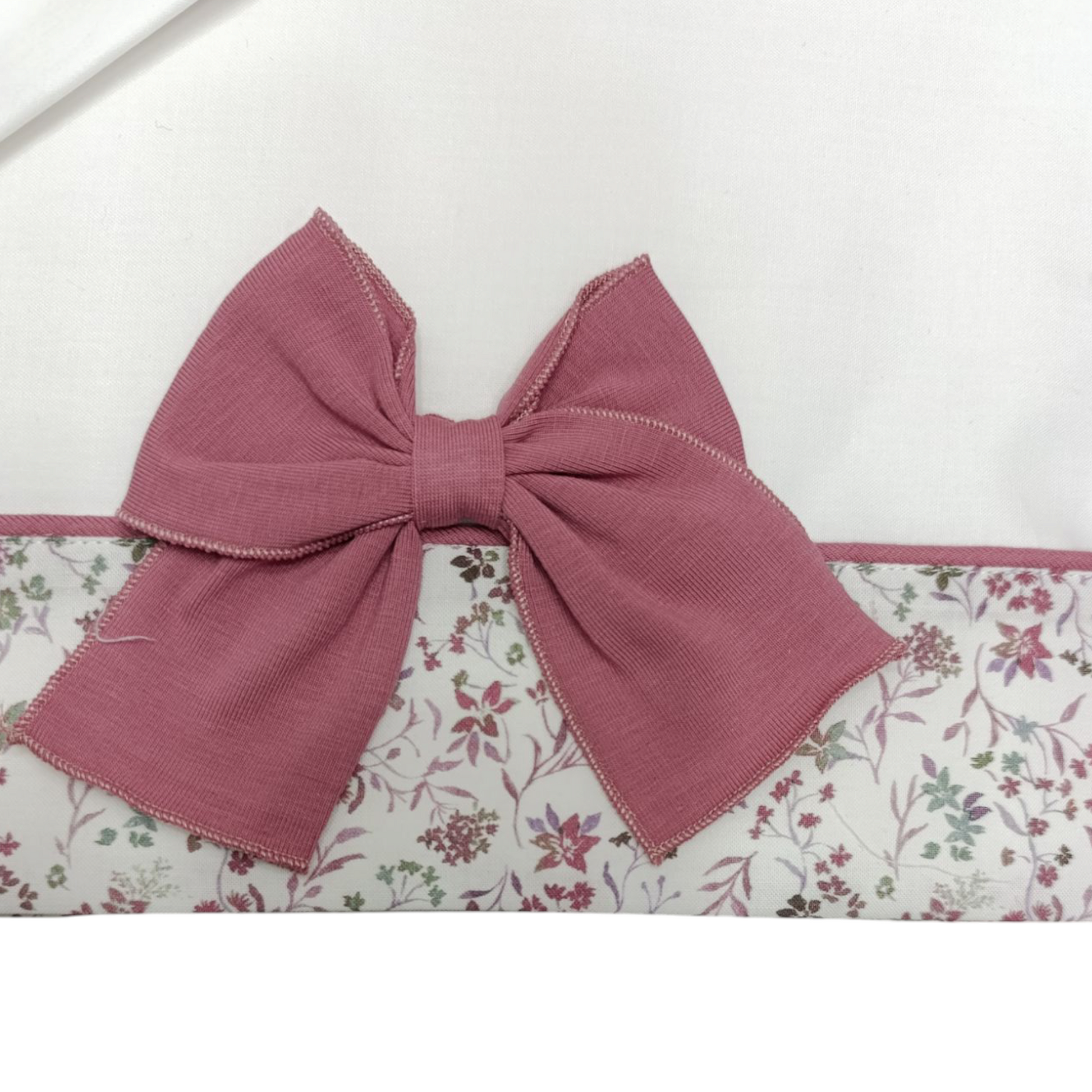 Set lenzuola culla cotone composto da sopra con applicazione sulla piega, sotto sempre teso con elastici perimetrali e federa.