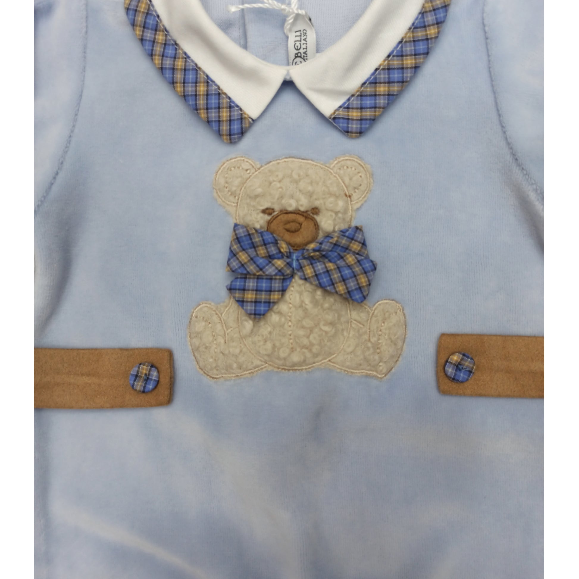 Tutina ciniglia nascita con orsetto in pelliccia ricamato a risalto, al centro colletto in tessuto multicolor e applicazione di pelliccia sui piedini,finta cintura nei fianchi linea Teneri & Belli, apertura sotto e dietro per facilitare il cambio.