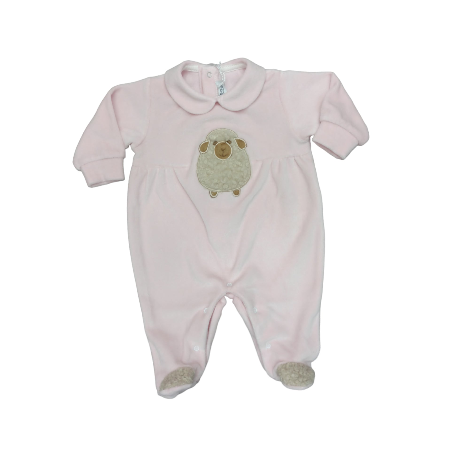 Tutina in ciniglia nascita Teneri & Belli con pecorella in pelliccia a risalto applicata al centro, applicazione di pelliccia sui piedini, apertura sotto e sul retro per facilitare il cambio.