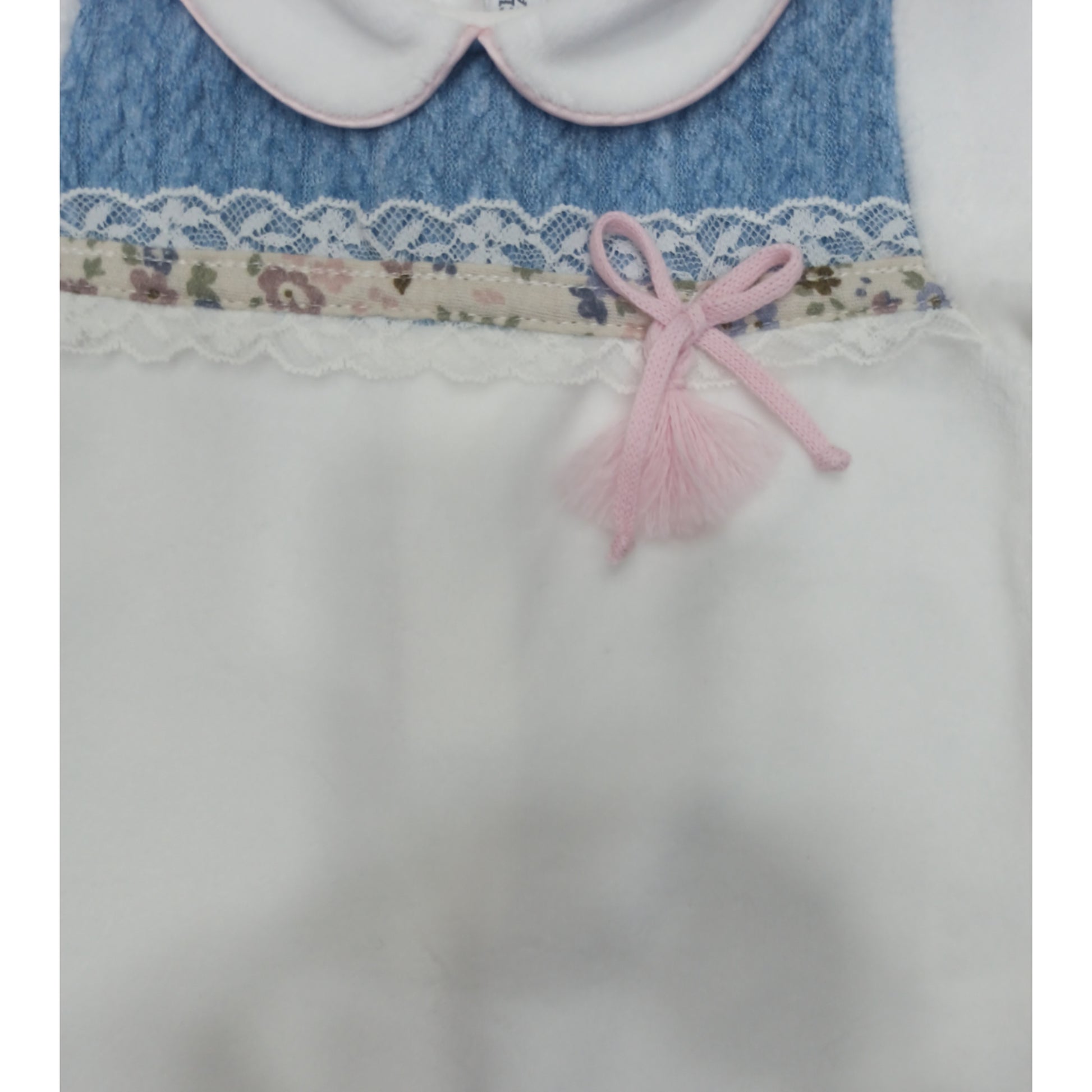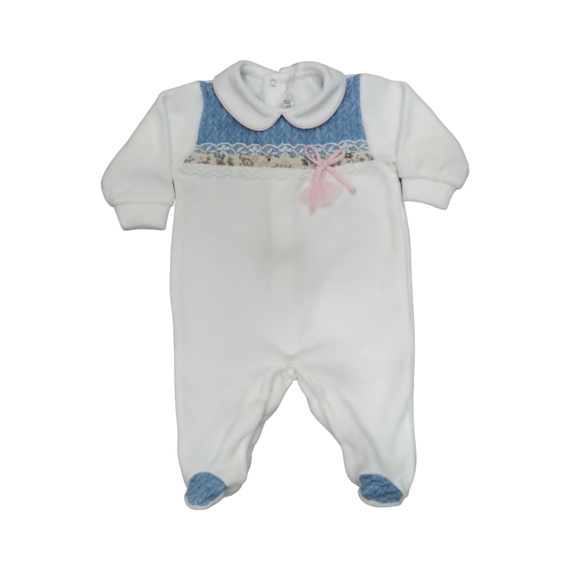 Tutina in ciniglia nascita Teneri & Belli con tessuto lana effetto spigato e applicazione di pizzo sulla parte superiore, applicazione di lana a contrasto sui piedini, apertura sotto e sul retro per facilitare il cambio.