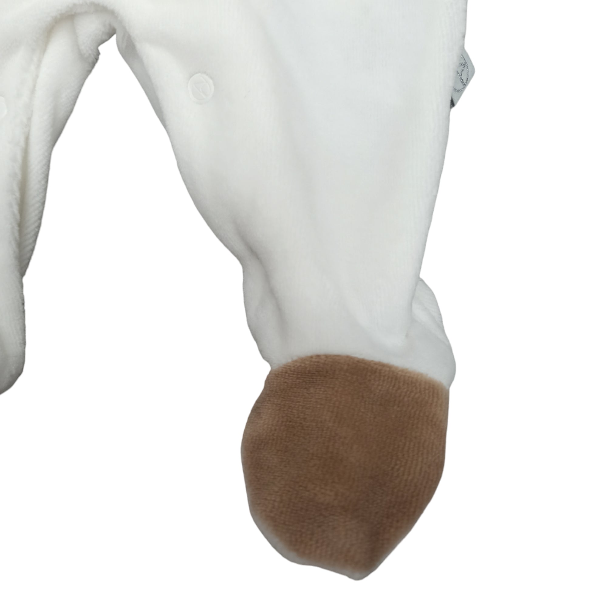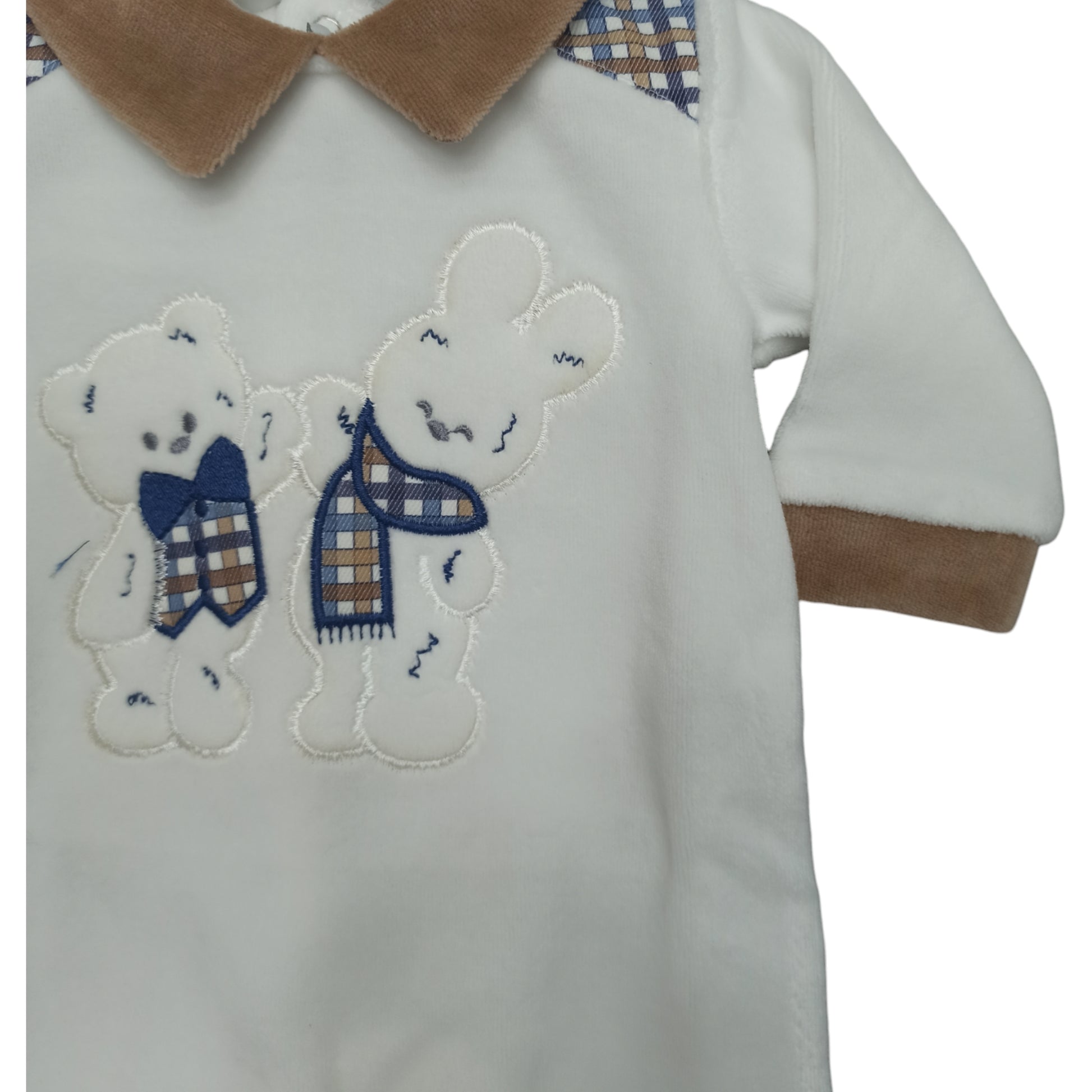Tutina nascita in morbida ciniglia linea Nazareno Gabrielli, con orsetti ricamati al centro a risalto, colletto, polsini e piedini a contrasto, apertura sotto e sul retro per facilitare il cambio.