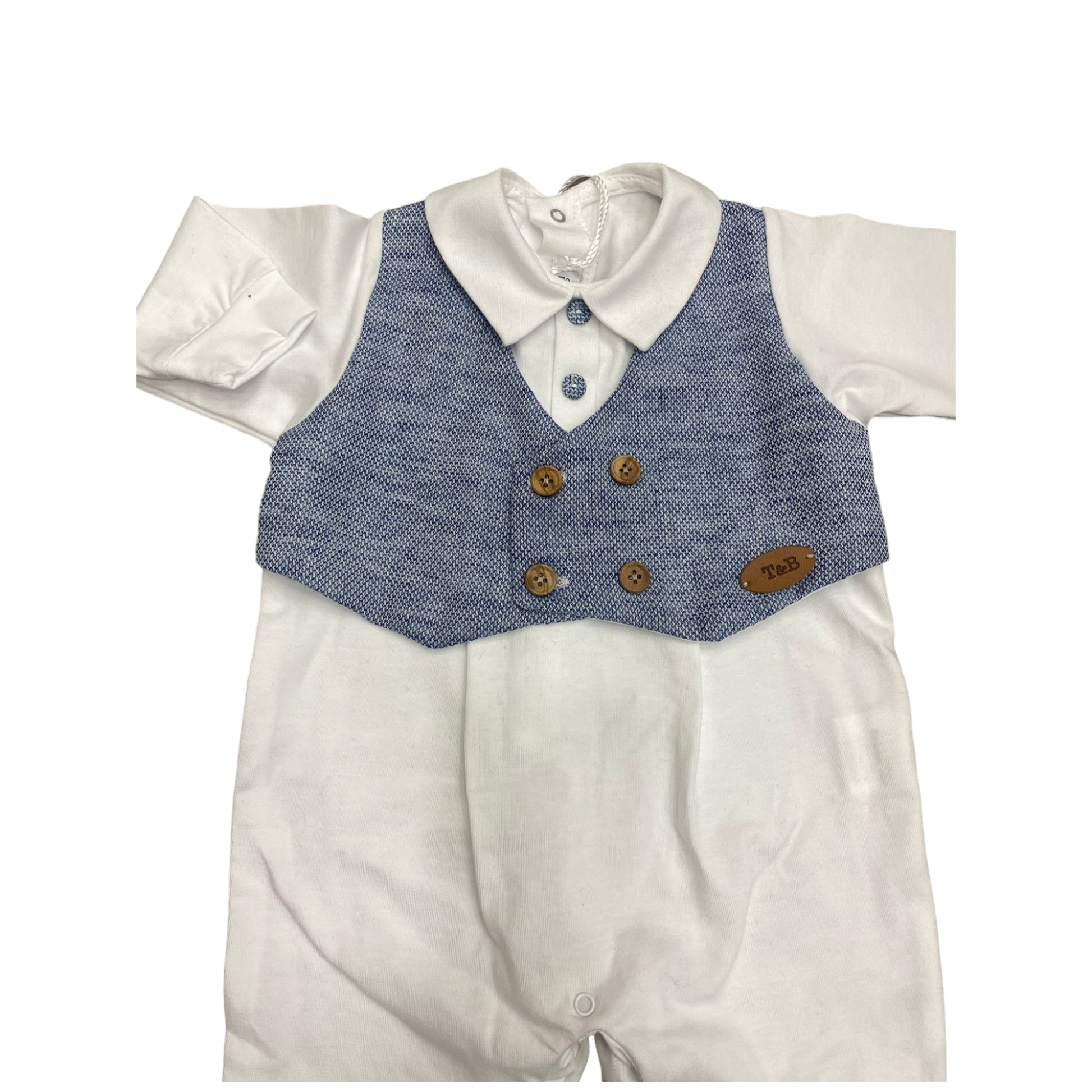 Tutina nascita in cotone, linea Teneri & Belli bicolore in cotone con finto panciotto doppiopetto applicato effetto jeans, colletto a polo in cotone e tessuto a contrasto sui piedini.