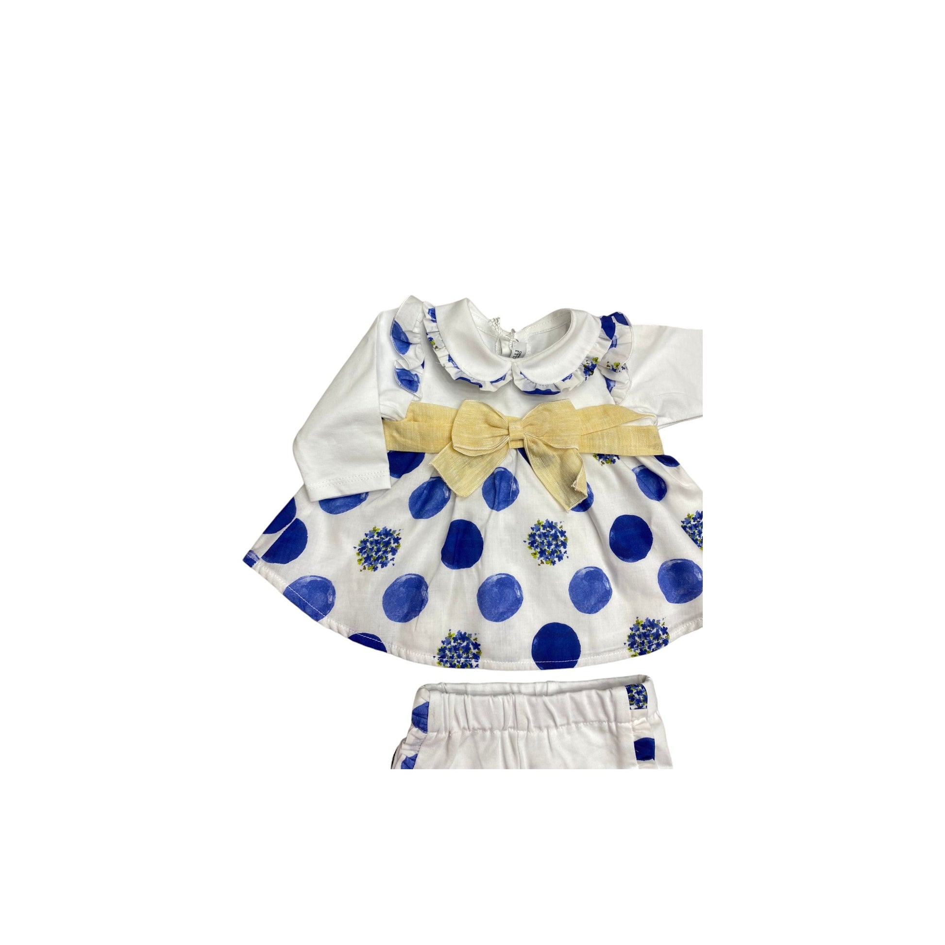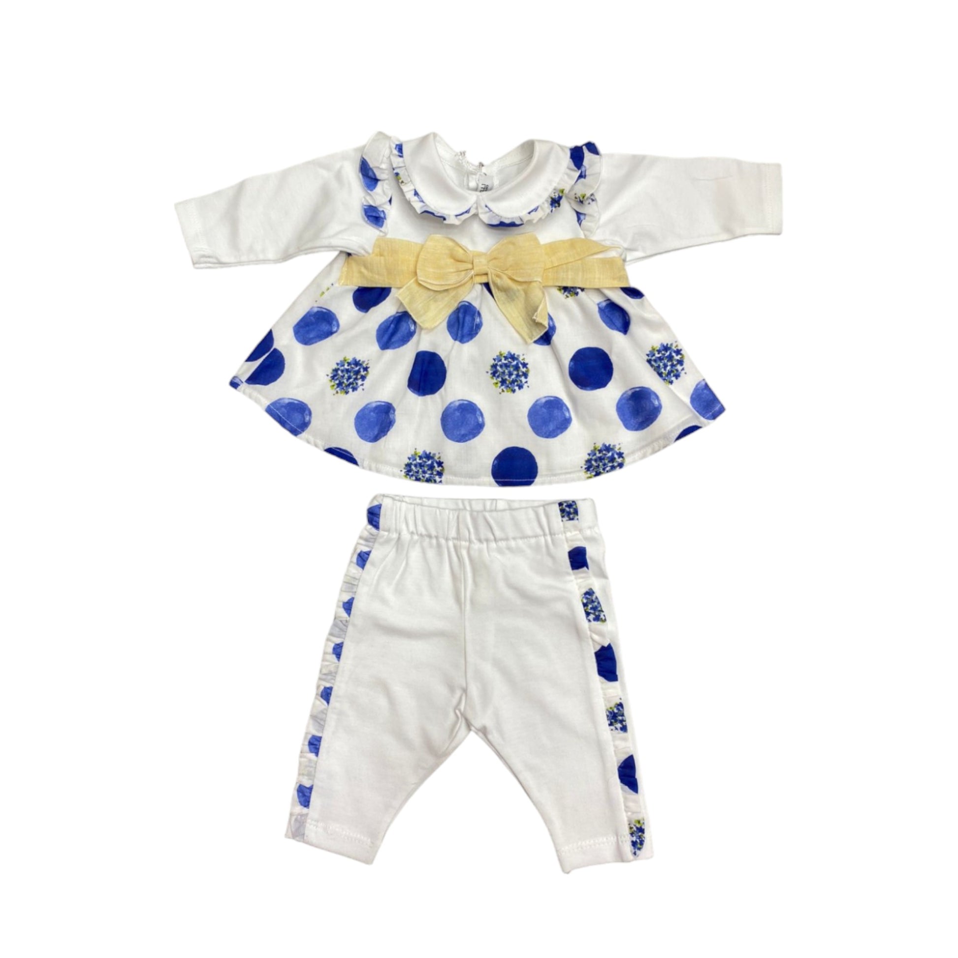 Vestina nascita cotone Teneri & Belli in tessuto stampato a pois con fiocco giallo a contrasto in vita e leggings tinta unita con striscia verticale a pois che richiama il vestito, colletto con stampa a pois e ruches sulle spalle a pois.